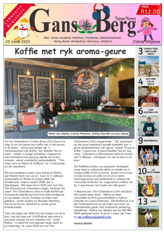 Gans-Berg Nuus / News is a weekly bilingual community newspaper serving Gansbaai and the surrounding Overstrand areas. Alternating between Afrikaans and English on the front page, it provides current local news, municipal updates, business advertising, and general items of interest. Businesses and p...