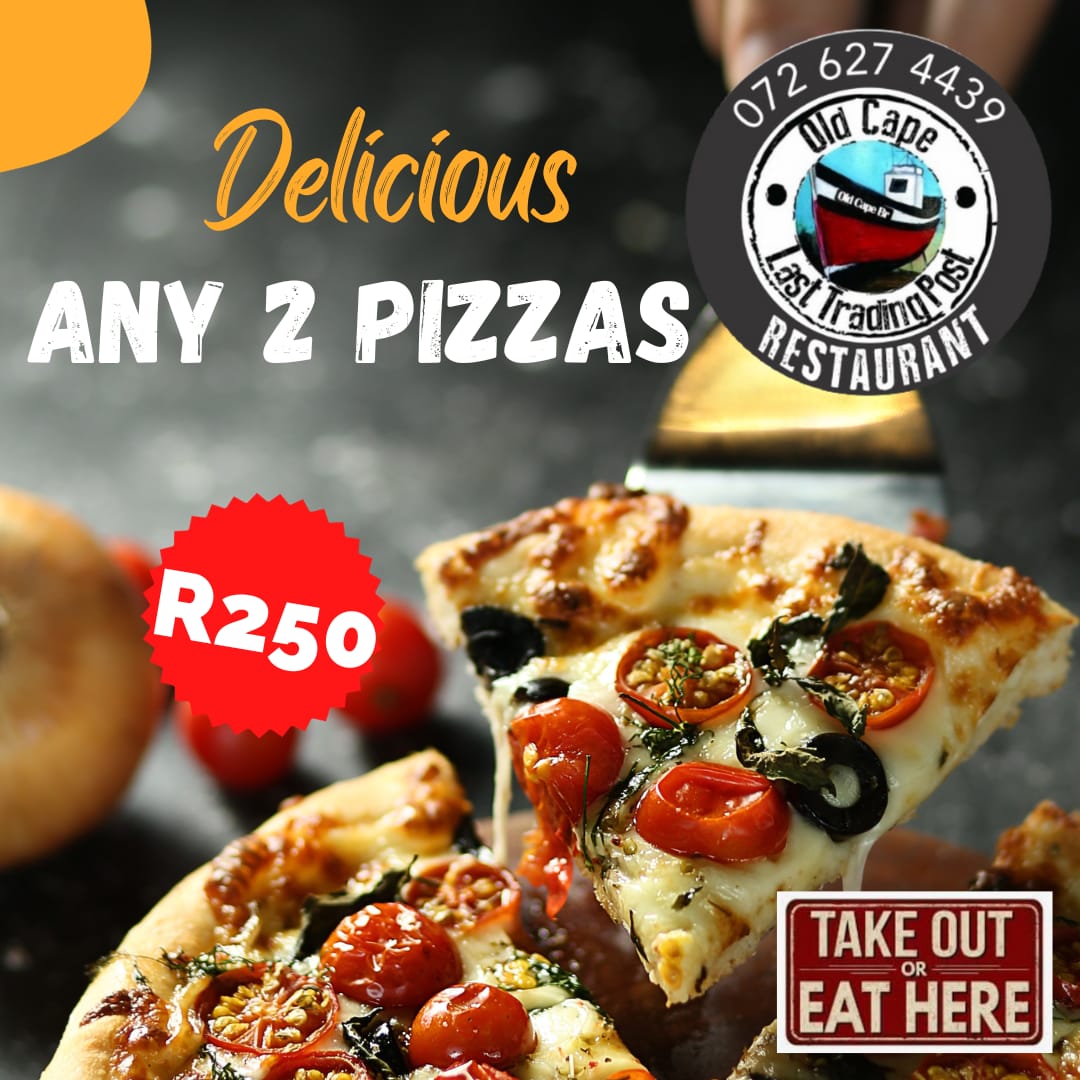 Enjoy any 2 delicious pizzas for ONLY R250!