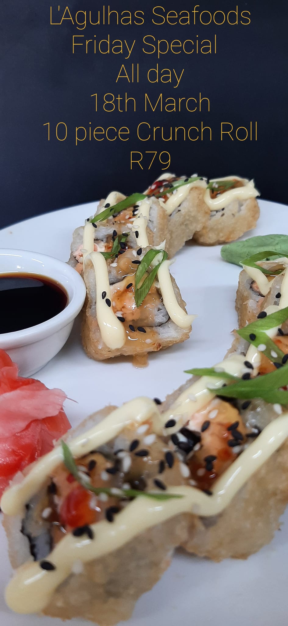 Visit L'Agulhas Seafoods this Friday, 18 March 2022 and take advantage of their crunch roll special!