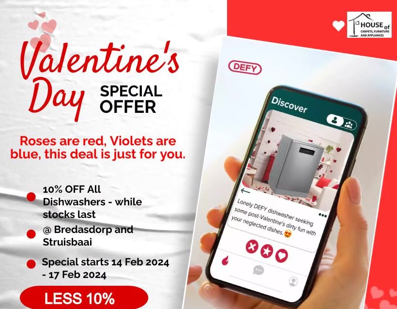 Enjoy our Valentine's special with 10% off on all dishwashers. Hurry, this sweet deal is valid from 14th to 17th February 2024, or while stocks last. Make your kitchen a love-filled haven!