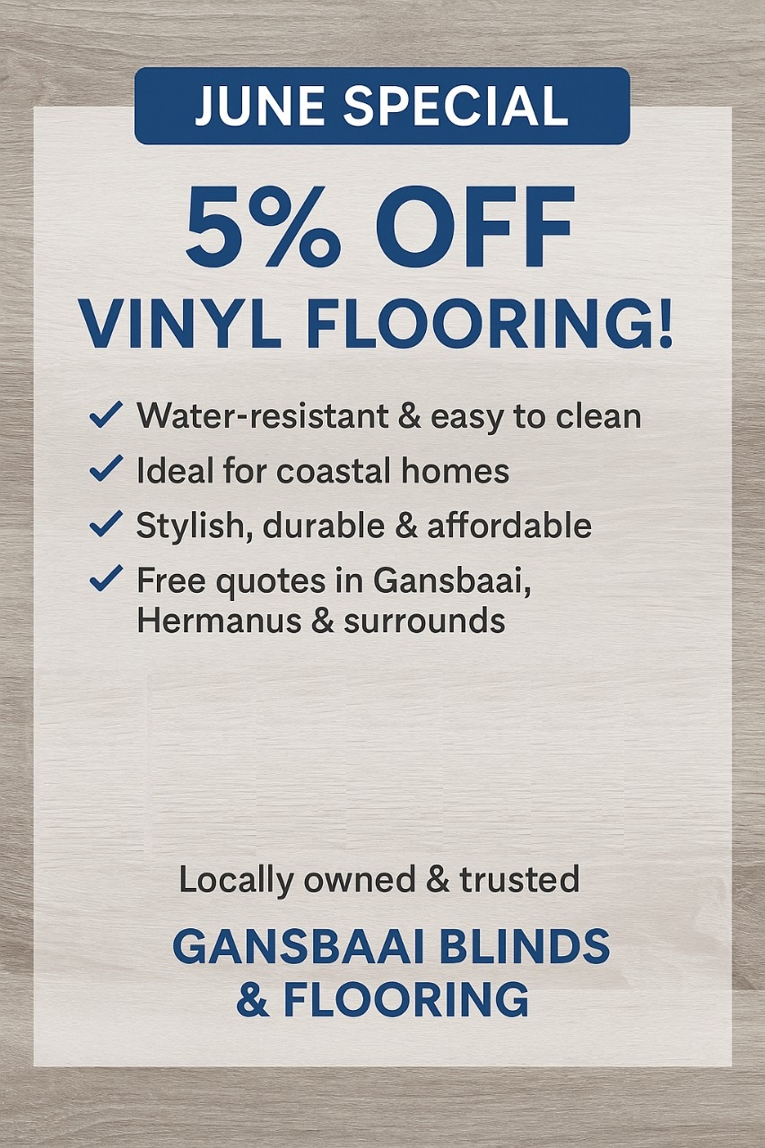 Don’t miss our June special at Blinds & Flooring Specialists Overberg! Enjoy 5% OFF vinyl flooring, perfect for coastal homes!