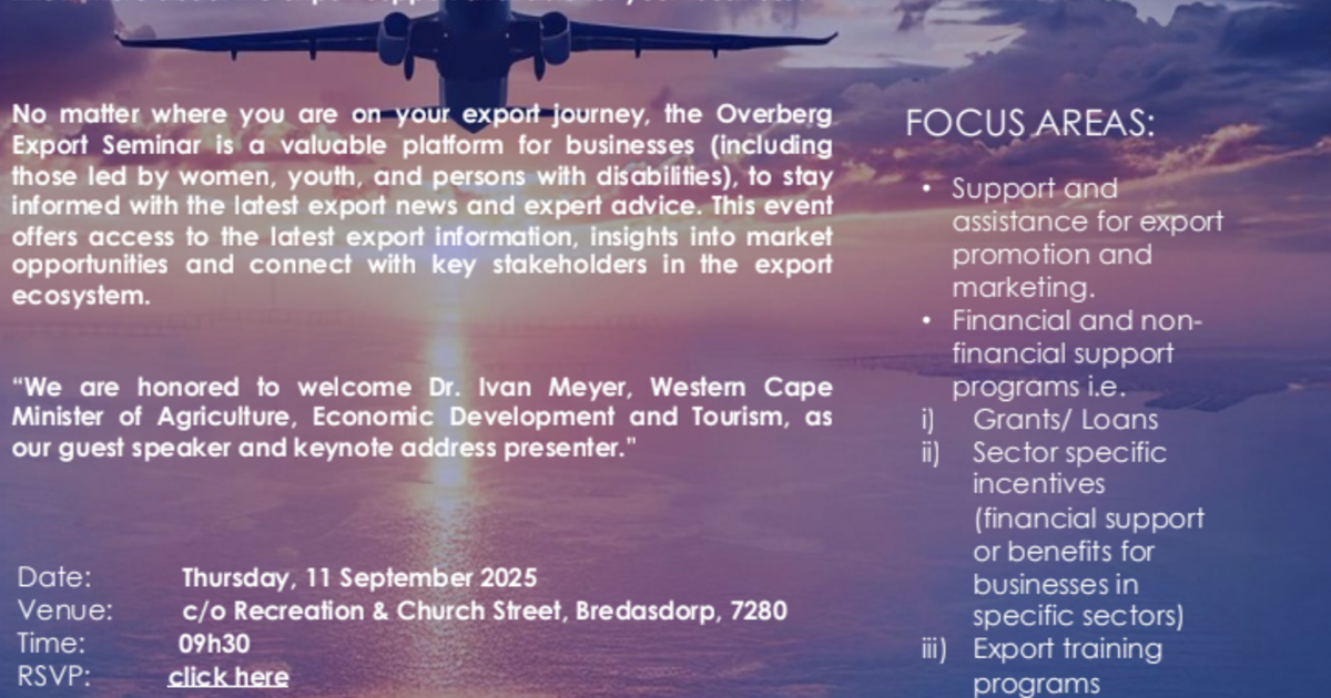 No matter where you are on your export journey, the Overberg Export Seminar 2025 is a valuable platform for businesses - including those led by women, youth, and persons with disabilities - to stay informed with the latest export news and expert advice.