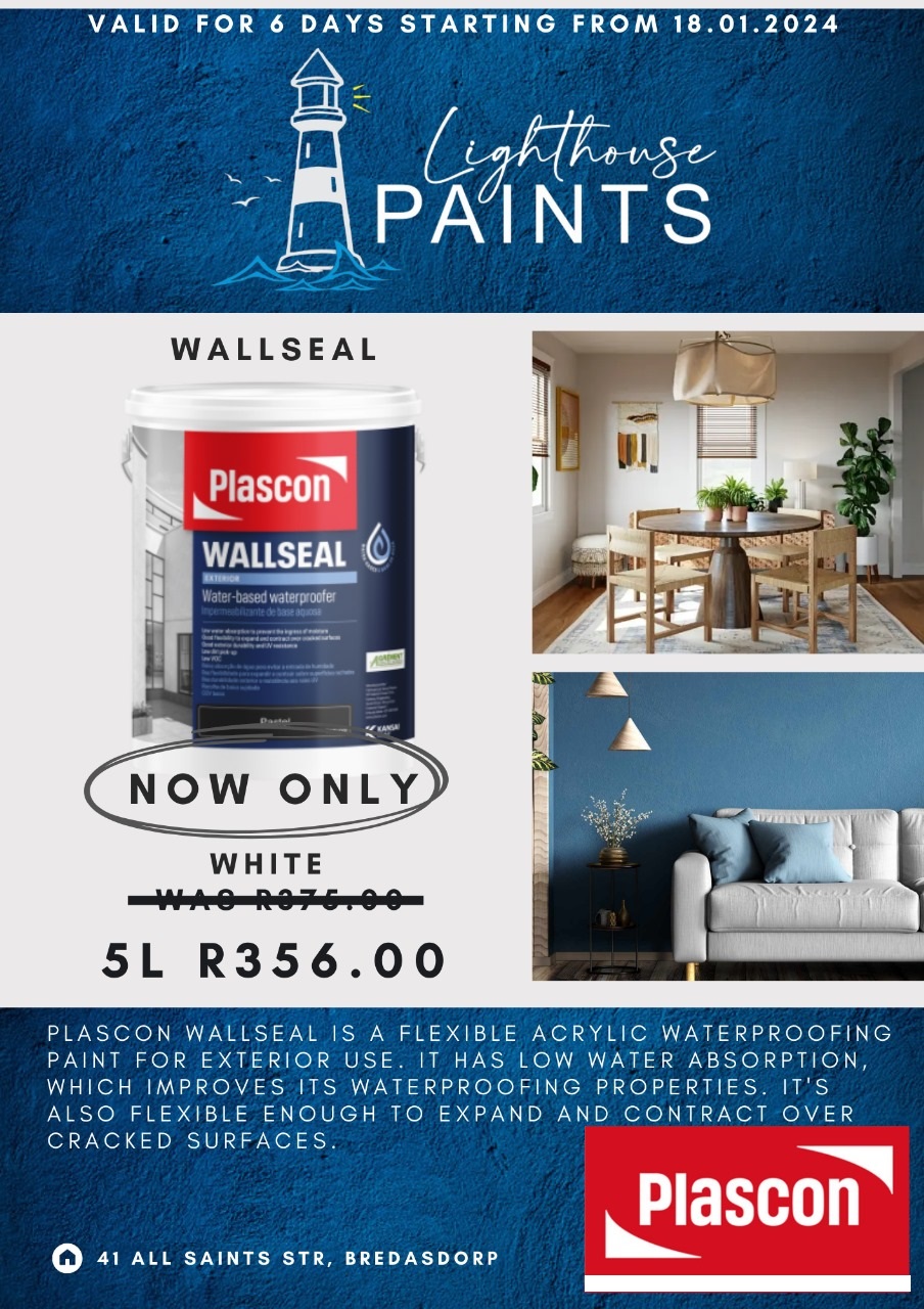 Lighthouse Paints presents Plascon Wallseal in white at a special price of R356.00 for 5L.