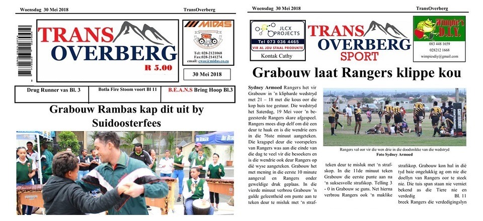 TRANSOVERBERG 'n nuusblad wat daarna strewe om gemeenskaps nuus weekliks in die vorm van 'n nuusblad weer te gee. Skole nuus, sport, munisipale aangeleenthede en enige goeie positiewe nuus is meer as welkom. TRANSOVERBERG in die OVERBERG, vir die OVERBERG.