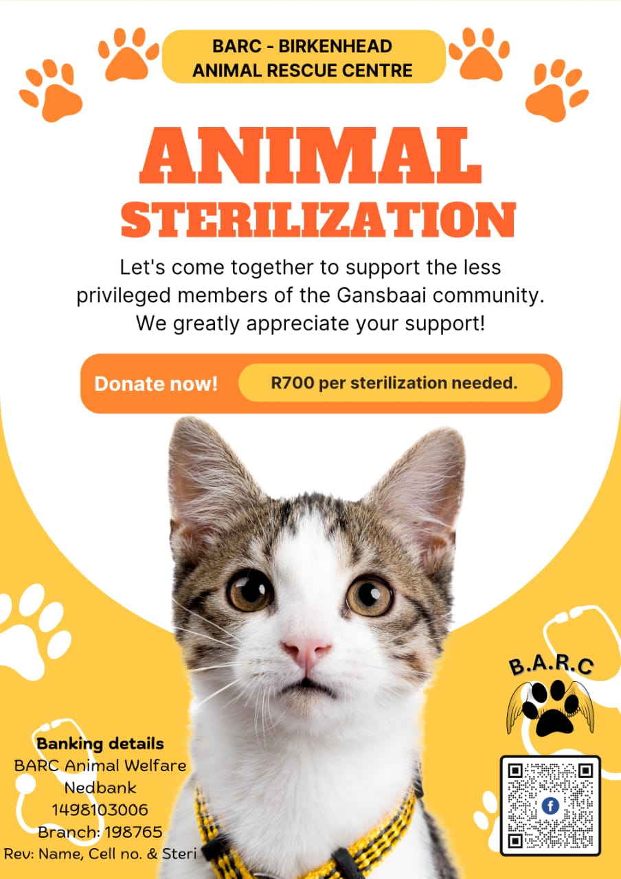 Keep an eye out for BARC and do your bit to help Gansbaai’s animal community in need by supporting the: