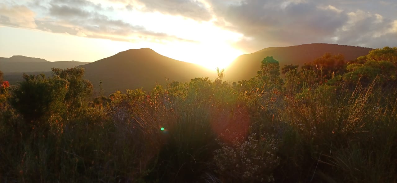 The first of two parting shots this week captures the sun setting warmly over the landscape, highlighting the textures and colours of flowering fynbos.