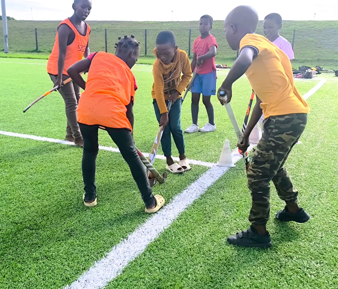 After school, the coaches offer a variety of sports and games at Spaces4All, the community sports field in Gansbaai. Once children have finished their homework, they race over to the sports field for a fun, physical afternoon and a healthy sandwich and apple. Here, a group of junior players are learning hockey techniques.