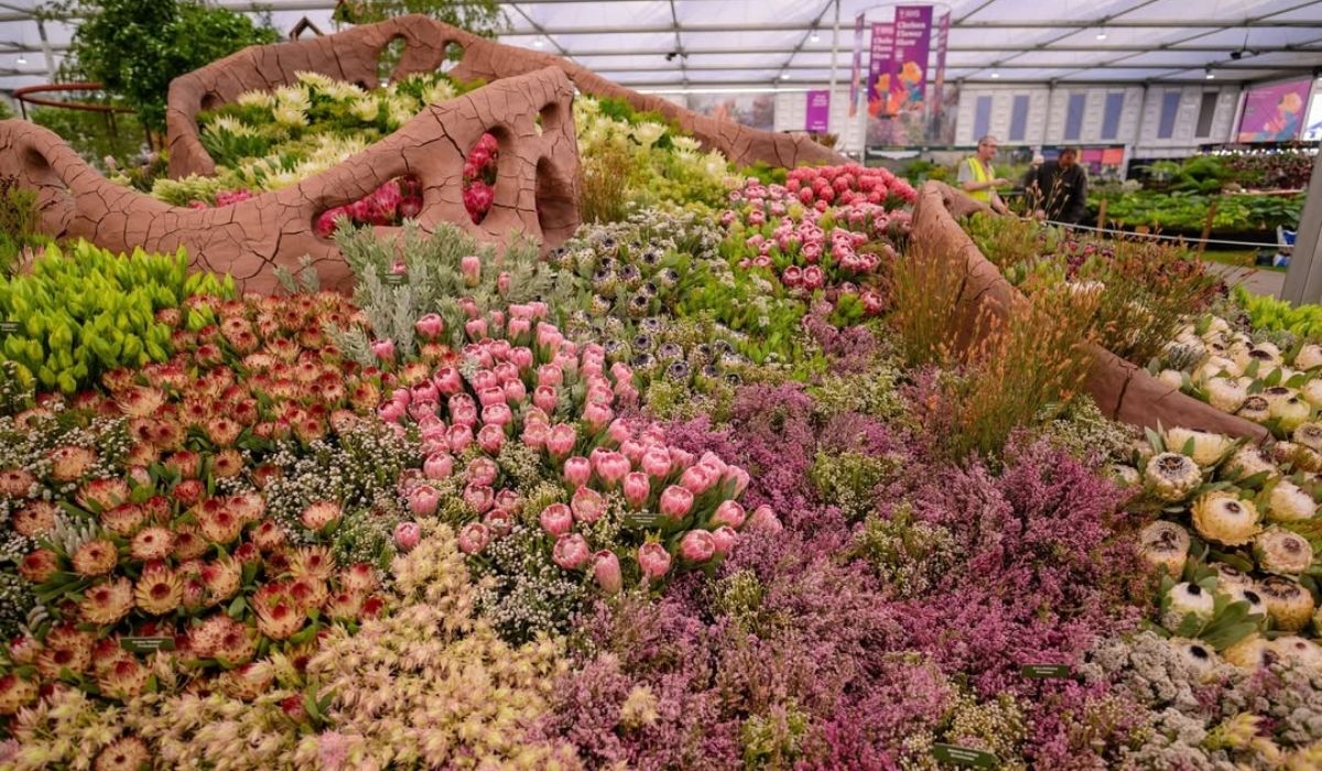 The winning display showcased a beach giving way to a dramatic canyon carved through a mountain of proteas, revealing cliffs and cascading waterfalls that plunged into an iconic amber-hued ravine below. The scene celebrated the cliff-dwelling flora and the renowned fynbos of the Cape.