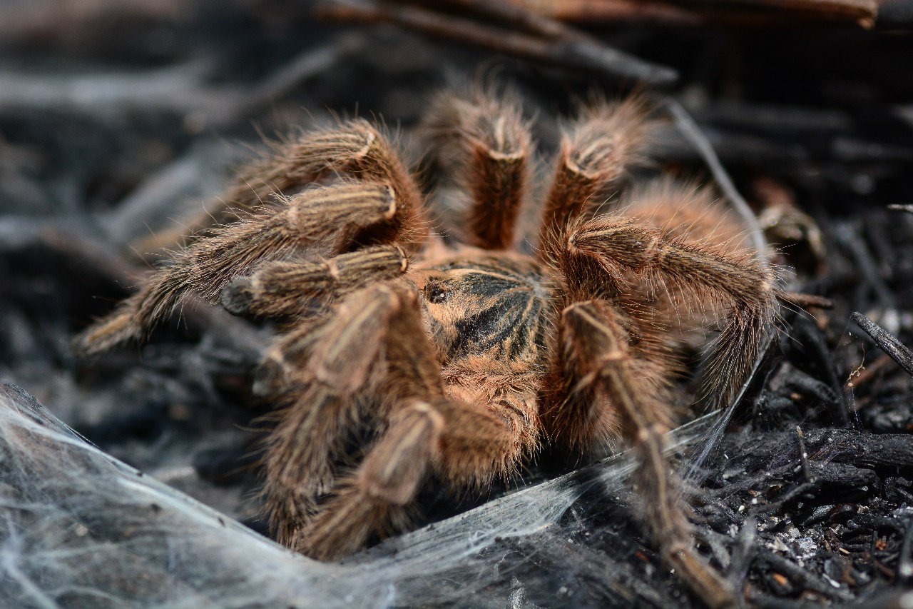 This is Harpactira caffreriana, an Overberg copper baboon spider, looking striking against the charred vegetation, a powerful symbol of survival and adaptation.
