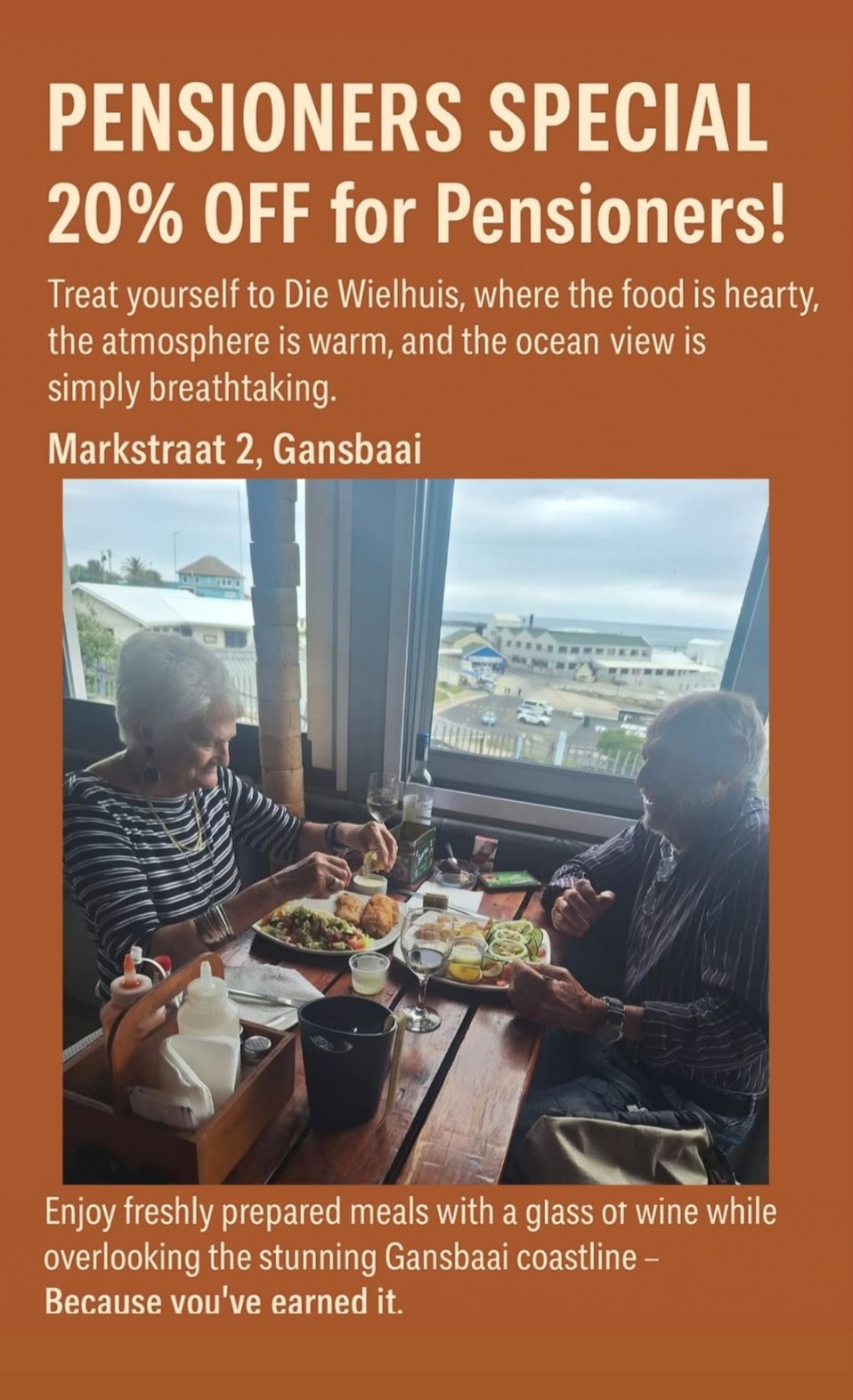 Treat yourself to hearty food, warm hospitality, and breathtaking ocean views right here in Gansbaai. Whether it’s lunch with friends or a special outing, enjoy freshly prepared meals and a glass of wine while soaking up the coastal charm.