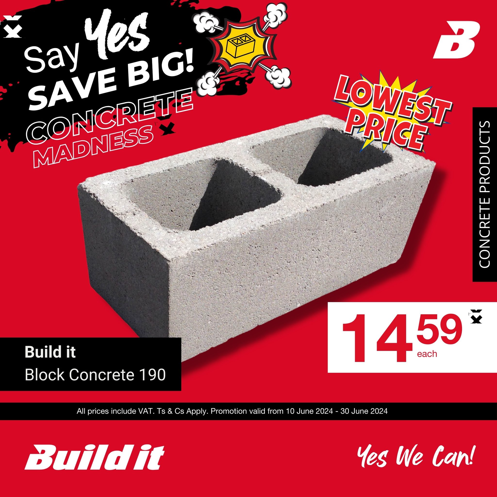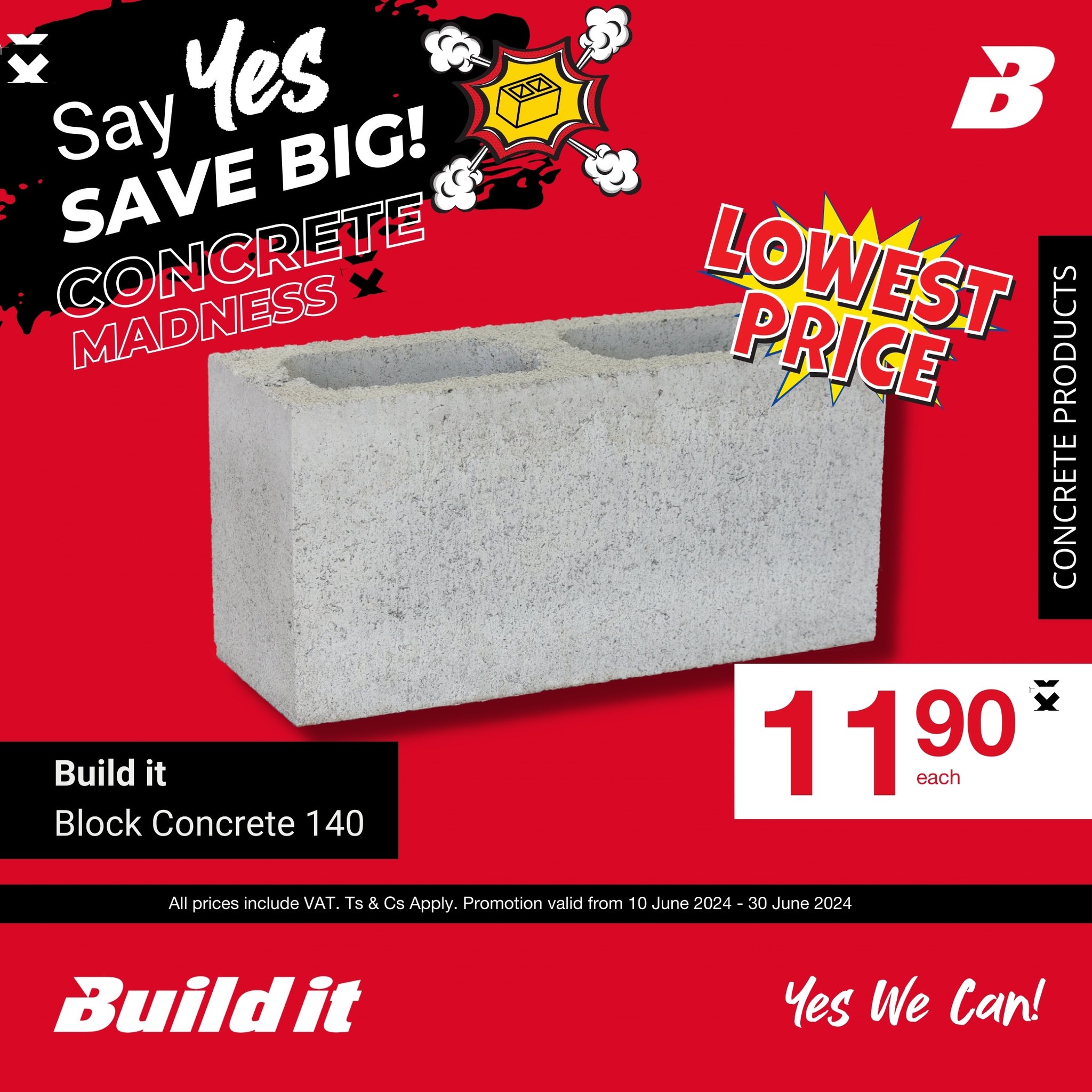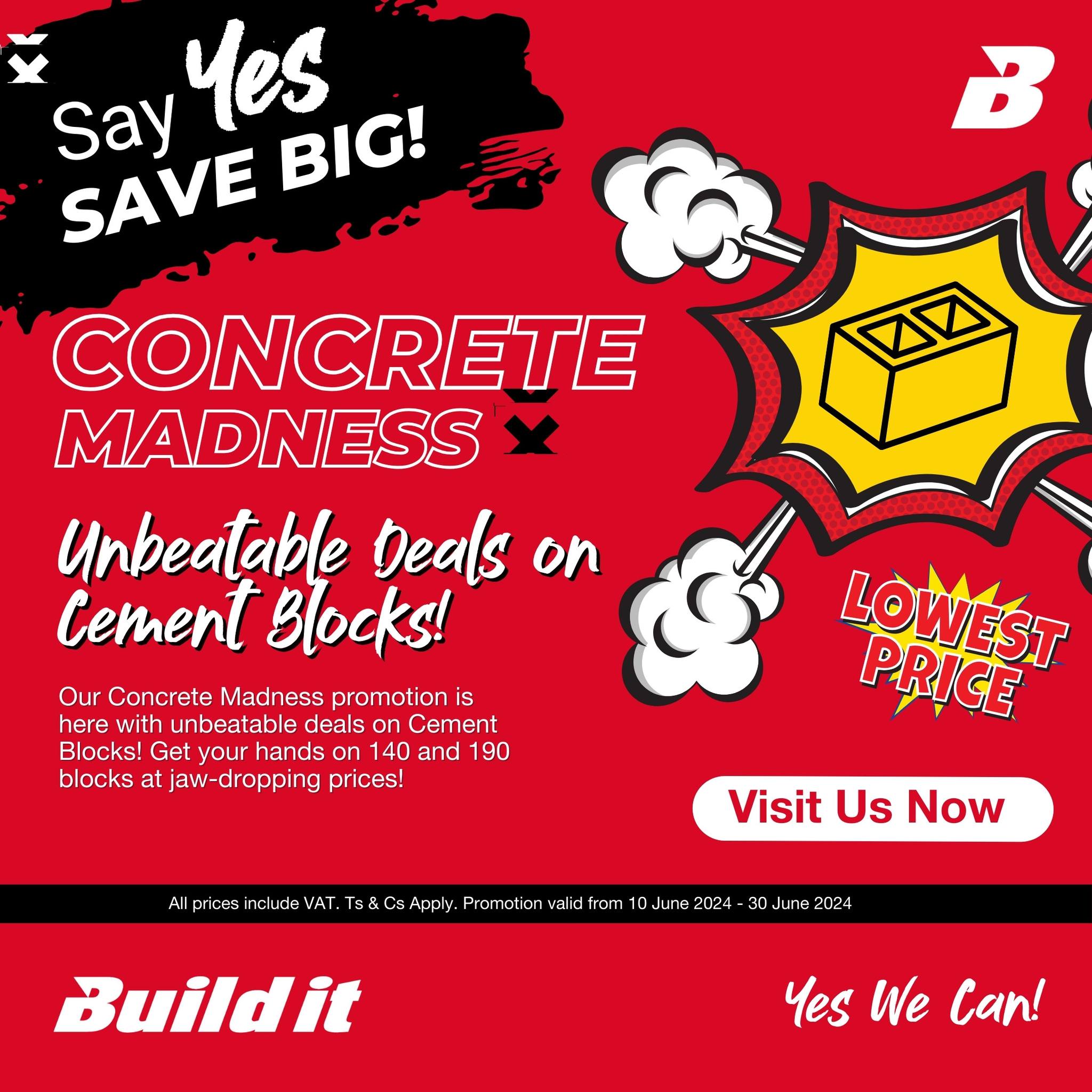 Our concrete madness promotion is here with unbeatable deals on cement blocks! Get your hands on 140 and 190 blocks at jaw-dropping prices! This offer is only available from 10 June to 30 June. Don’t miss out!