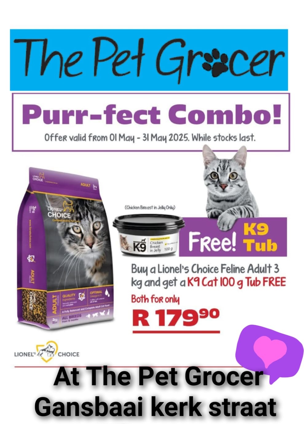 Buy a 3kg Lionel’s Choice Feline Adult cat food and get a K9 Cat 100g Chicken Breast in Jelly tub absolutely FREE - all for just R179.90!