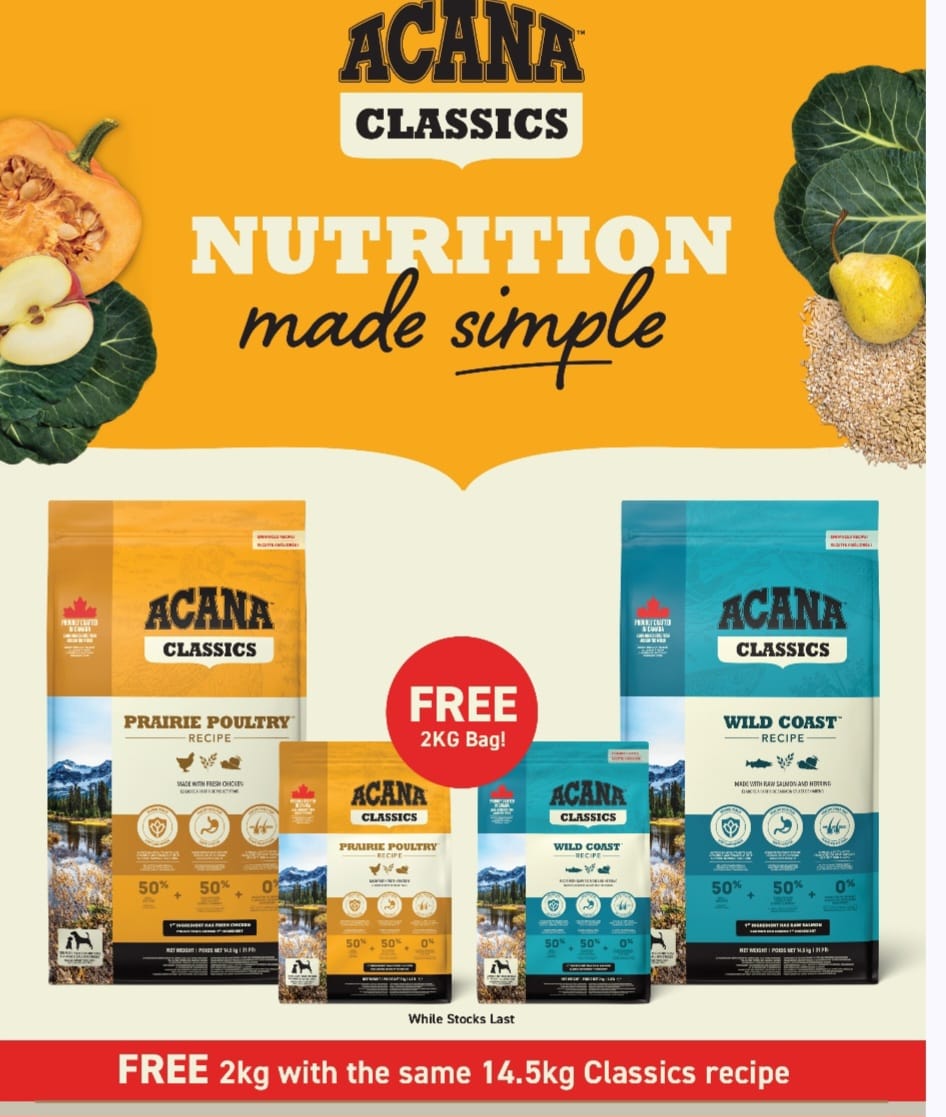 For a limited time, when you buy any 14.5kg bag of ACANA Classics (Prairie Poultry or Wild Coast), you’ll get a FREE 2kg bag of the same recipe!