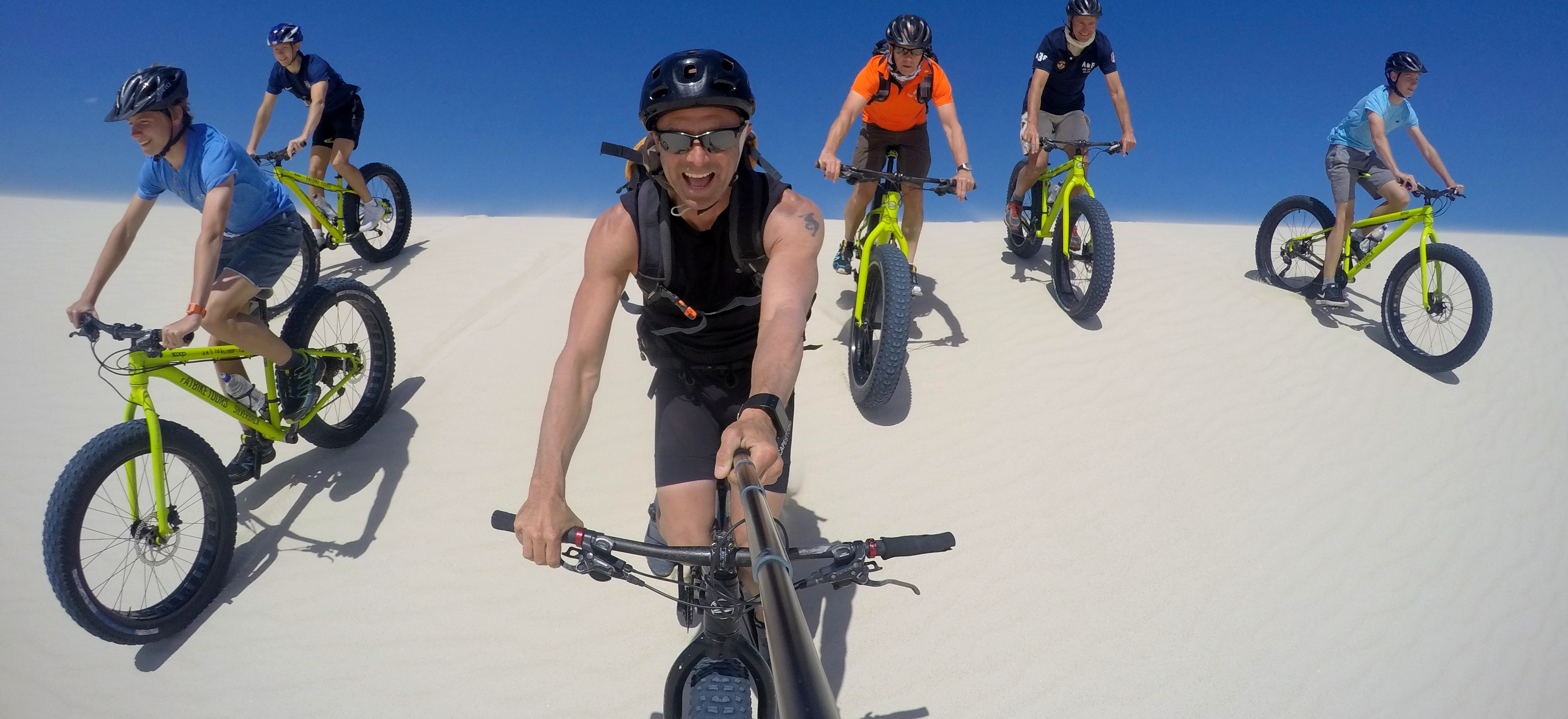 Fatbikes weigh about 15kg and have wide 4.7-inch tyers pumped to a low pressure. The wide tread prevents them from sinking into the sand.