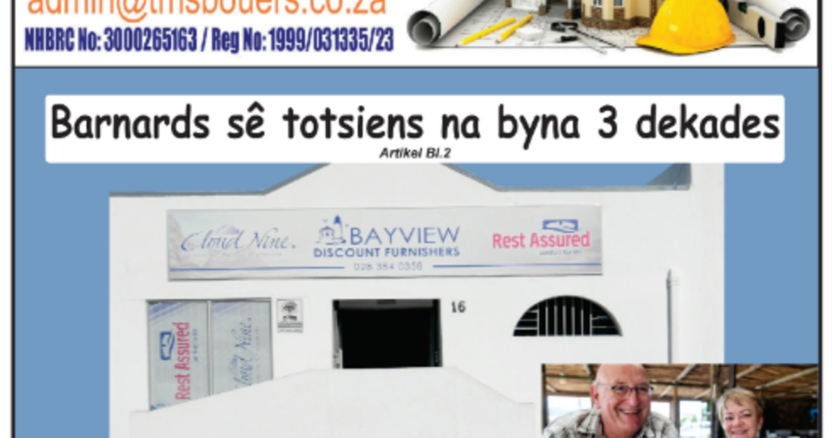 Jan and Doreen Barnard say goodbye after nearly three decades of owning Bayview Discount Furnishers, thanking the community for years of loyal support as the business changes ownership. The well-known South African musician Anton Goosen celebrated his 80th birthday, sharing reflections on his life and career with the community.