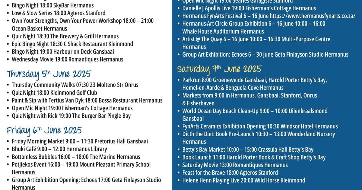 Here’s the latest Overstrand Tourism Diary, filled with music, markets, walks, workshops, and live entertainment...