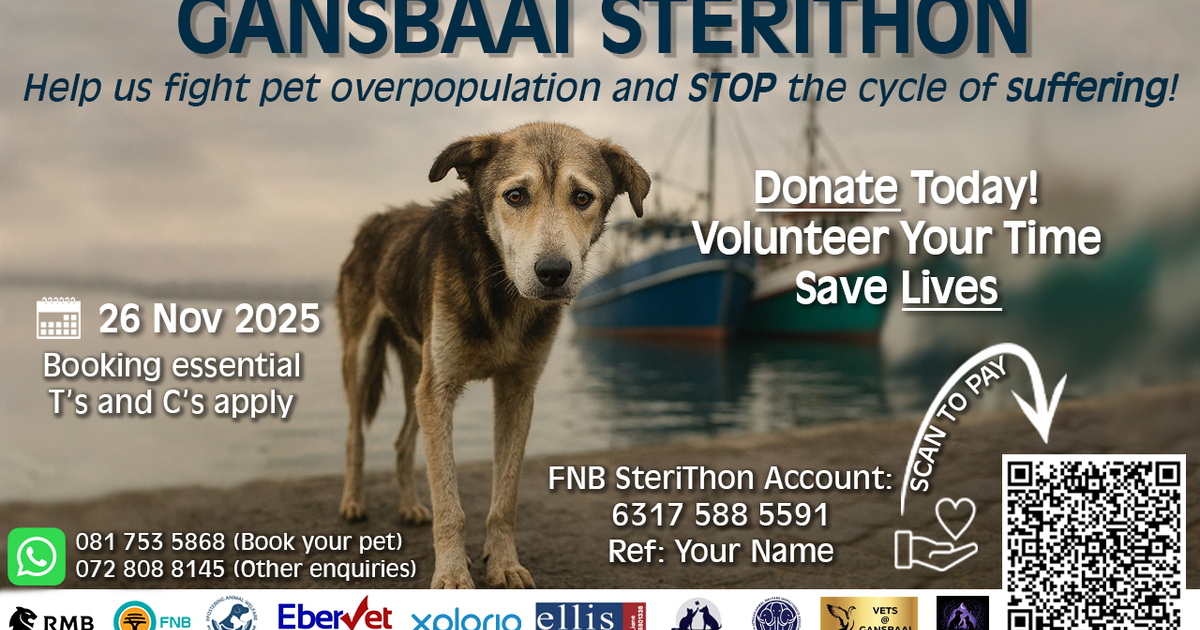 GANSBAAI, HELP OM ONS HONDE EN KATTE TE STERILISEER en die epidemie van straat- en mishandelde diere in ons dorp te stop. Ons gaan GROOT! Ons het u hulp nodig om 'n sukses te wees. Ondersteun asseblief deur 'n skenking aan die saak te maak of deur 'n poot by die Gansbaai Toerismekantoor te koop. Elke bietjie help en gaan direk na die saak.