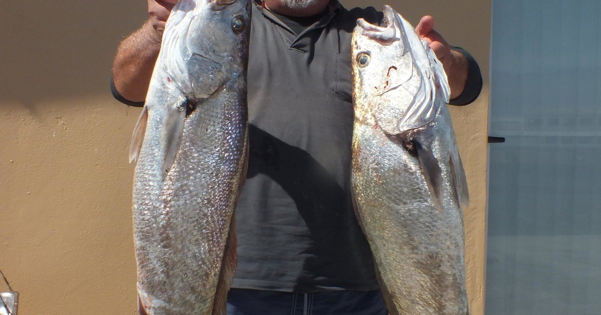 Gawie Krugel met sy twee mooi kabeljoue (6.05kg en 5.6kg) wat hy verlede Saterdag vanaf Johan Burmeister se boot, Nu-Nu tydens ‘n Birkenhead Boothengelklubkompetisie gevang het. Behalwe vir die swaarste- en 2de swaarste vispryse, het Gawie ook die prys vir die swaarste sak ingepalm.