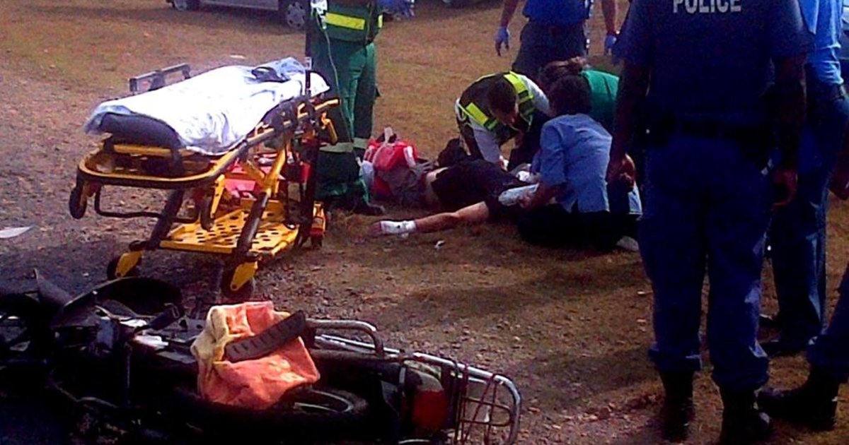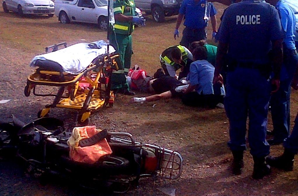 Die ongeluk het op die Kleinbaai-pad in die omgewing oorkant Blompark se woongebied plaasgevind. ‘n Inwoner van Kleinbaai het met sy voertuig langs die pad stilgehou om sy huishulp op te laai. Kobus het op sy motorfiets aangekom en die voertuig gesien en wel stadiger gery. Na bewering was die aankomende motorfiets in die truspieël van die voertuig se “blindekol” en die bestuurder het ‘n U-draai gemaak, met Kobus direk langs hom. Cassie Carstens van Overstrand Medical Response was vinnig op die toneel en die nodige mediese bystand is verleen. “Ek is baie dank aan Cassie verskuldig vir sy deeglike hantering van my besering,” het Kobus agterna in die hospitaal gesê. Hy is gestabiliseer en inderhaas per ambulans na Hermanus Mediclinic vervoer. As gevolg van die geweldige swelling, asook die skoonmaak van die lang en gapende wond oor die volle lengte van sy onderbeen, kon Kobus eers op Saterdag, 10 Januarie 2015 geopereer word waartydens ‘n staalpen in die skeengedeelte van sy been ingesit is. Op Maandag, 12 Januarie 2015 moes Kobus ‘n veloorplanting ondergaan om die oopgevlekte been te bedek. As gevolg van die geweldige bloedverlies gedurende die paar dae, het hy met die ter perse gaan van hierdie berig reeds 6 eenhede bloed ontvang. Verdere operasies, onder andere vleisoorplantings, wag nog op hom. Intussen het Kobus gestabiliseer en is vanuit die Intensiewe Sorgeenheid na ‘n saal oorgeplaas om aan te sterk. Hy verduur geweldige pyn en die been word konstant onder verdowing gehou. Dinsdagaand het hy Gansbaai Courant telefonies meegedeel dat hy gedurende die dag die ergste pyn nóg ervaar het. Sy bekende motorfiets, waarmee hy gereeld saam met Gansbaai se motorfietsklub, die Scattered Links, Overberg Chapter, aan besigtigingsritte en liefdadigheidsprojekte deelgeneem het, asook aan die klub se jaarlikse winter-motorfietsritte na Sutherland, sal waarskynlik afgeskryf word. Sinvolle opmerkings is teenoor Gansbaai Courant gemaak oor die groot risiko verbonde aan U-draaie met voertuie, veral vir die op- en aflaai van huishulpe op die Kleinbaaipad. “Daar is ‘n groot parkeerarea regoor Gansbaai Academia beskikbaar wat veilig vir hierdie doel benut kan word,” het iemand wat verkies om anoniem te bly, gesê.