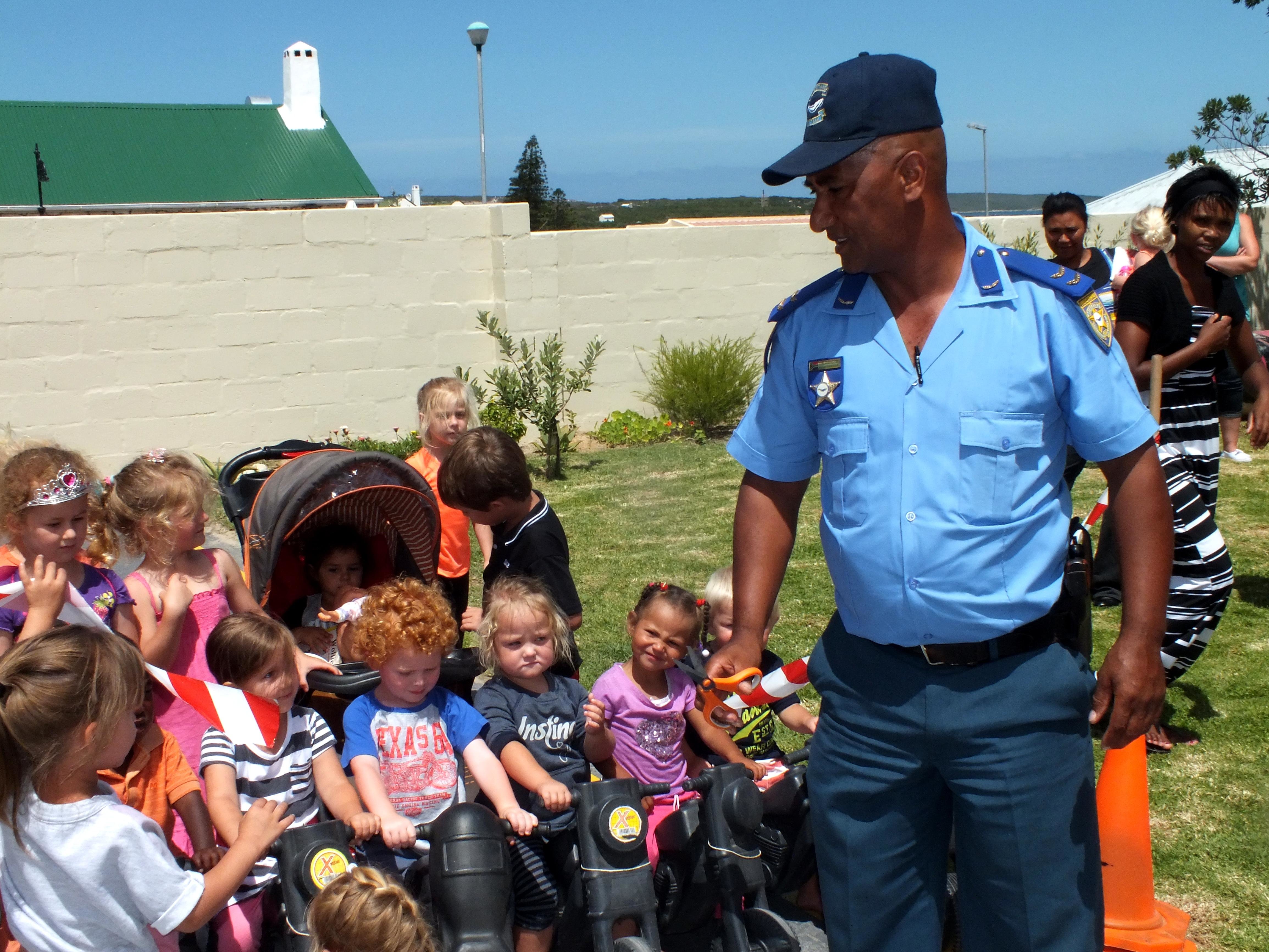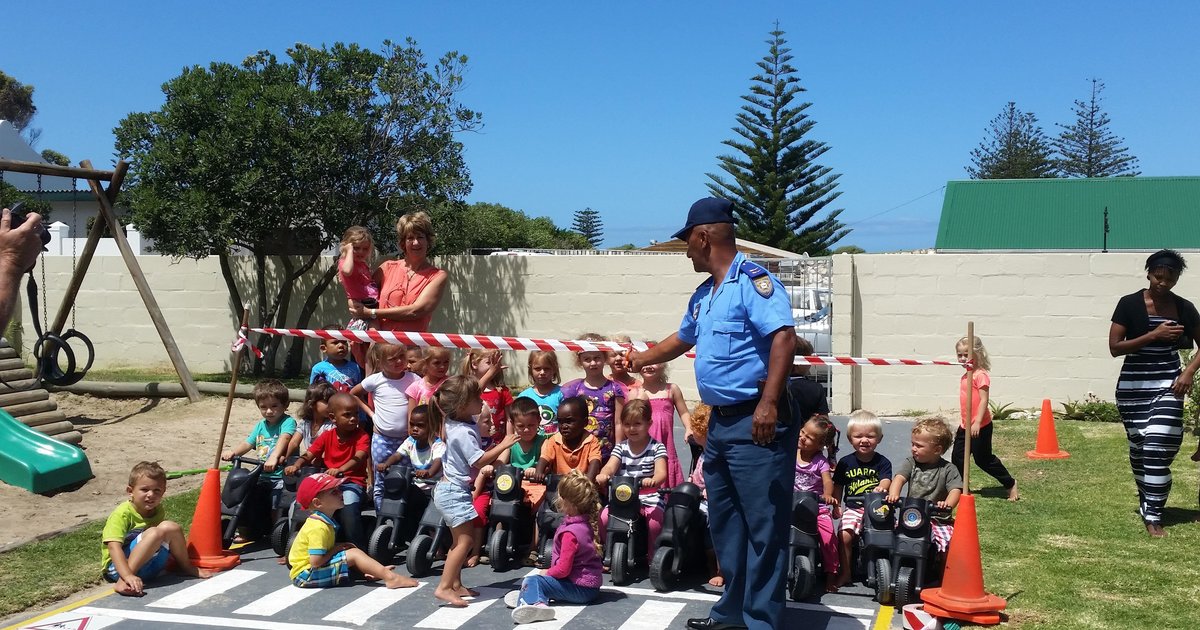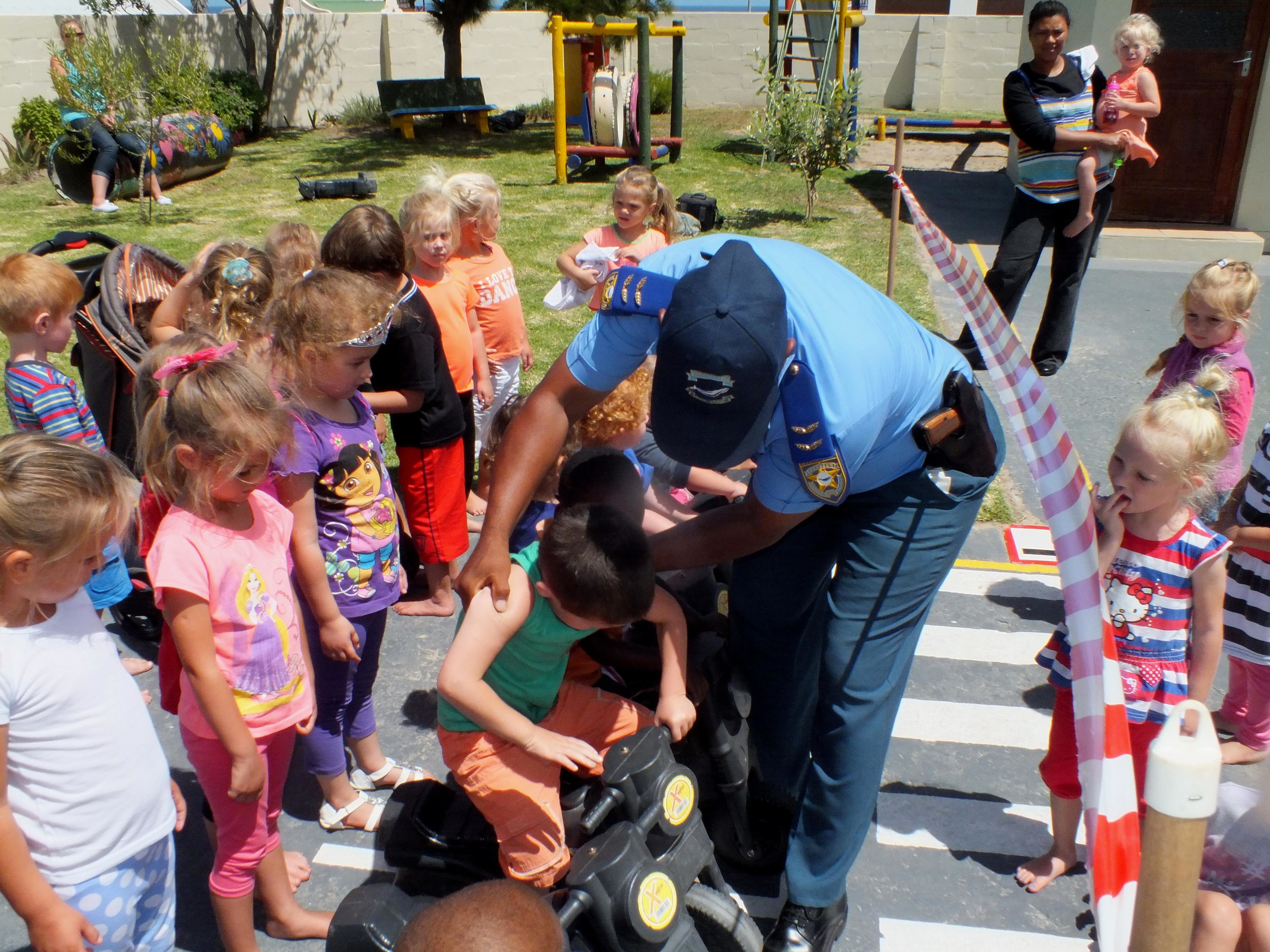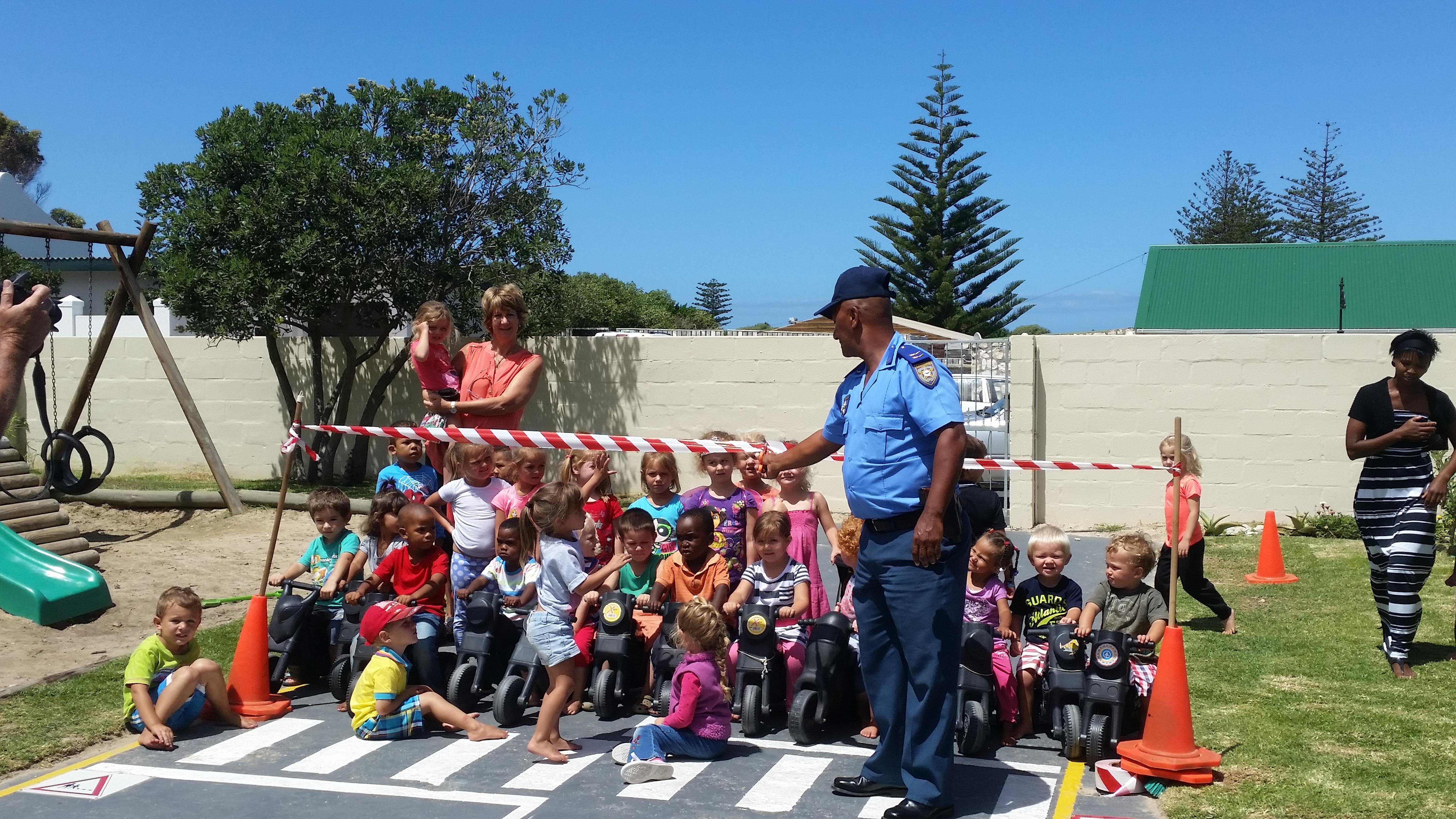 Intussen is ‘n volledige “teerstraat met verkeerstekens” vanaf die hekkie tot by die skool aangebring. Sowat 16 “motorfietse” is aangeskaf, waarvan sommiges deur ouers geskenk is, en die area maak vir die volgende voorsiening: middellyne, stippellyne, sirkel, robot, stopstraat, parkering, voetoorgang en veel meer. Die baan is amptelik op Woensdag, 11 Februarie 2015 deur Tony Blakenberg, Assistent Superentintend Verkeer, geopen. Tony het ook enkele verkeersreëls aan die opgewonde kleuters verduidelik, maar hulle ook gerusgestel deur te sê dat hulle nooit vir verkeersmanne en -vroue bang moet wees nie. “Ons is daar om julle te help en regulasies toe te pas en as julle nie verkeersreëls oortree nie, sal julle nooit by ons in die moeilikheid wees nie,” het Tony vir hulle gesê. Nadat hy die lint geknip het, was dit chaos met die “motorfietse” en was alle verkeersreëls vergete!