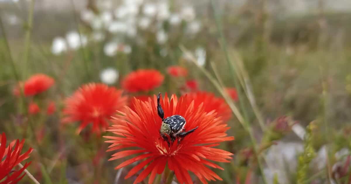 Our parting shot this week, a rare vygie (Lampranthus tenuifolius) with its spotty monkey beetle pollinator.
