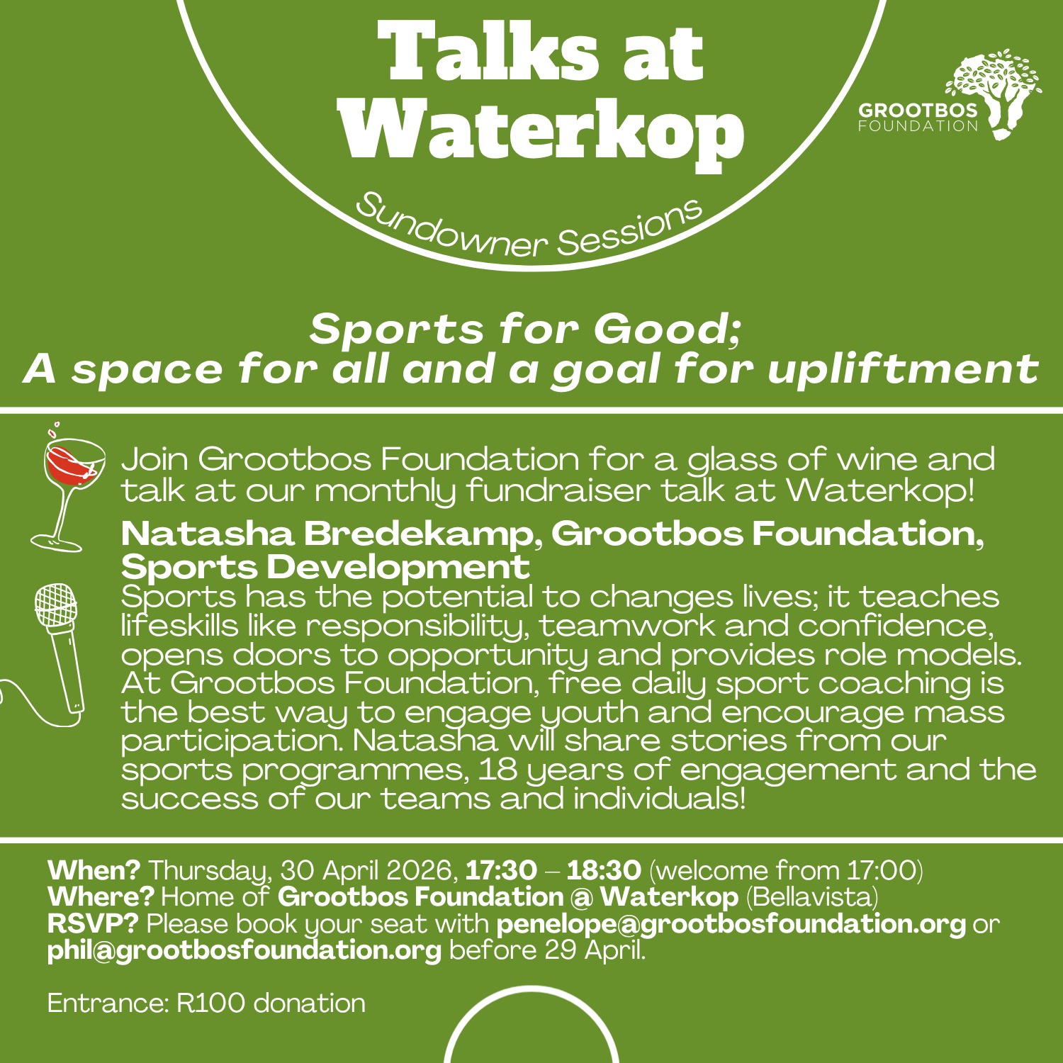 Entry: R100 donation. RSVP to penelope@grootbosfoundation.org before 29 April.
