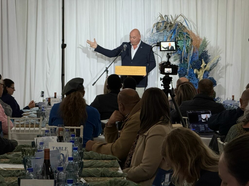Susan Visagie (CFO and owner of the Great White House Restaurant) treated us to time-lapse footage of Susy the Whale, the skeleton of an adult Southern Right Whale now suspended in the restaurant’s ceiling. She spoke of Wilfred’s seemingly impossible dreams and how, after 25 years by his side, she’s learned that with hard work, any dream can come true. Susan then introduced Chef Chris Pead, whose foraging-inspired menu exemplifies the region’s deep culinary roots. A short break followed, accompanied by Renate Riedemann’s evocative violin, perfectly capturing the natural beauty of Gansbaai.