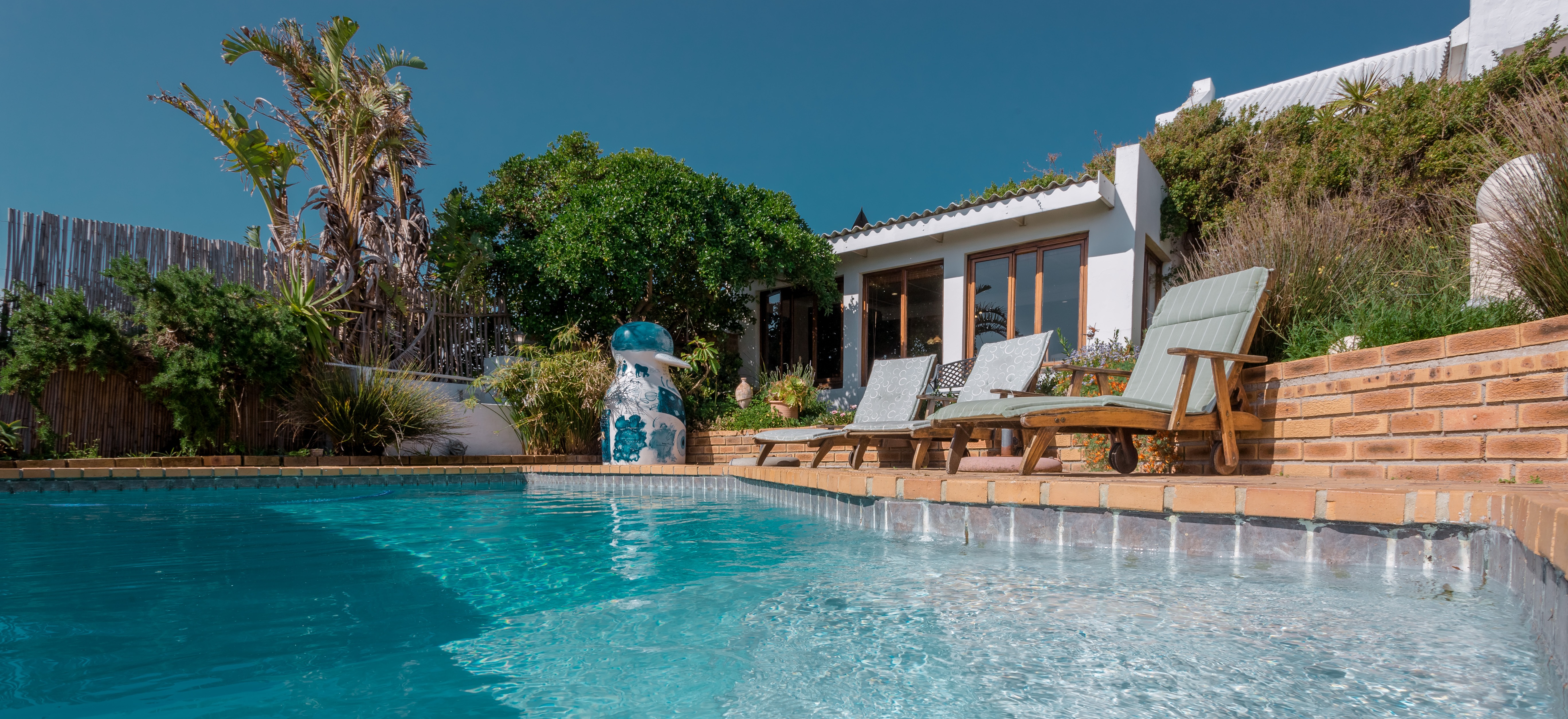 The Superior Suites have private patios with lovely views of the garden, plunge pool and Walker Bay.