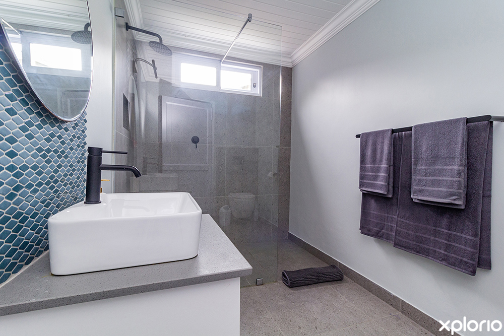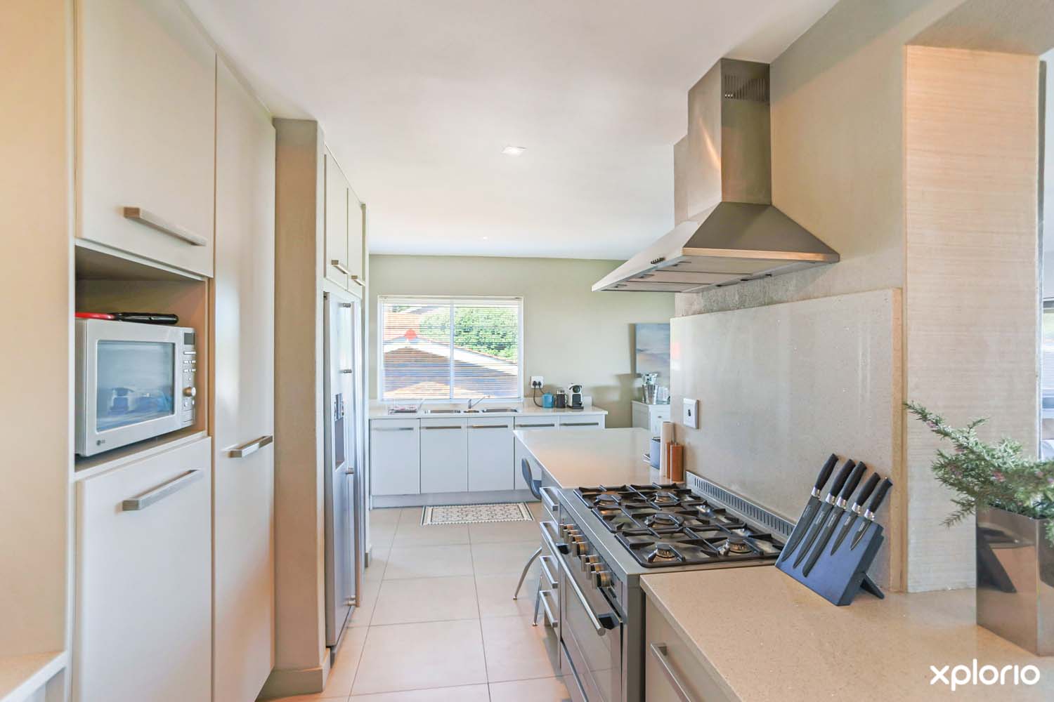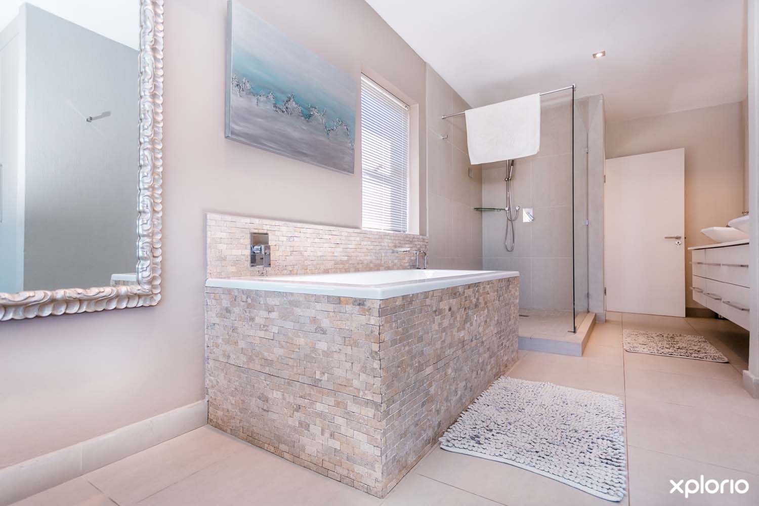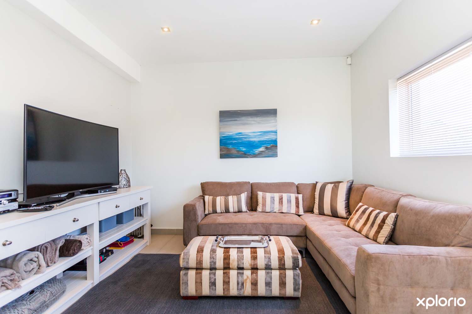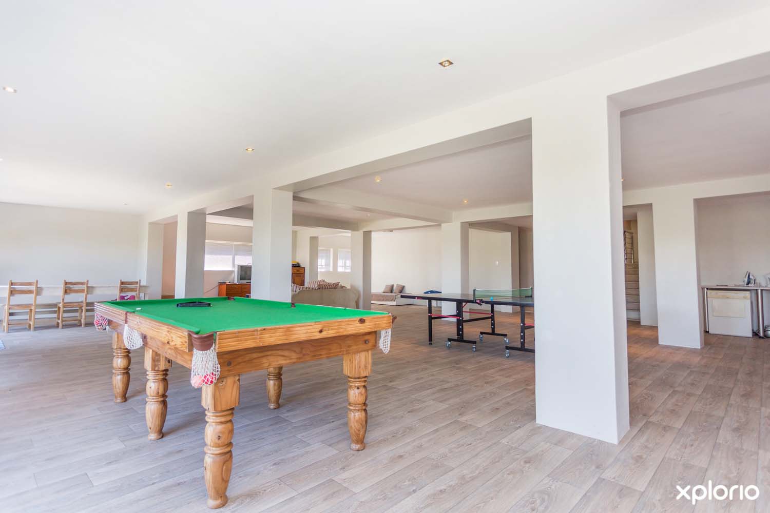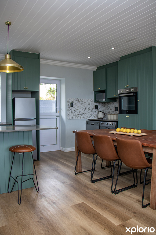 The open-plan living space has a modern, fully-fitted kitchen, dining area and lounge that leads to a large patio. The undercover braai area has a friendship table and seating arrangement for entertaining. There is a separate TV lounge.