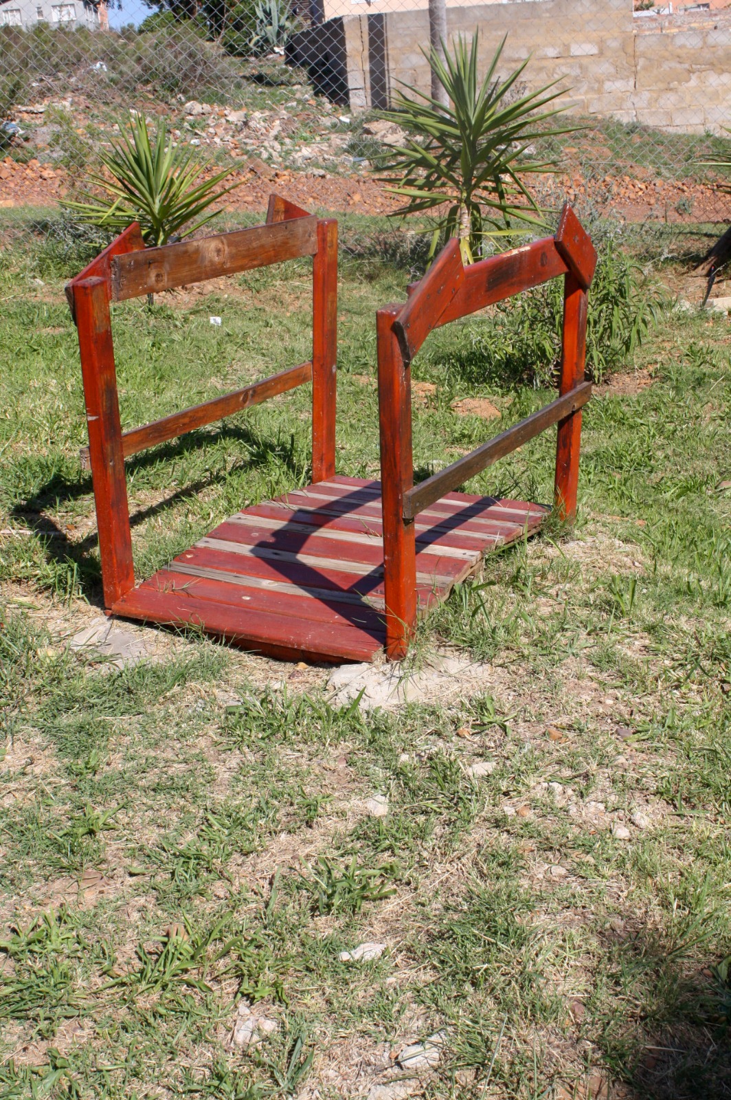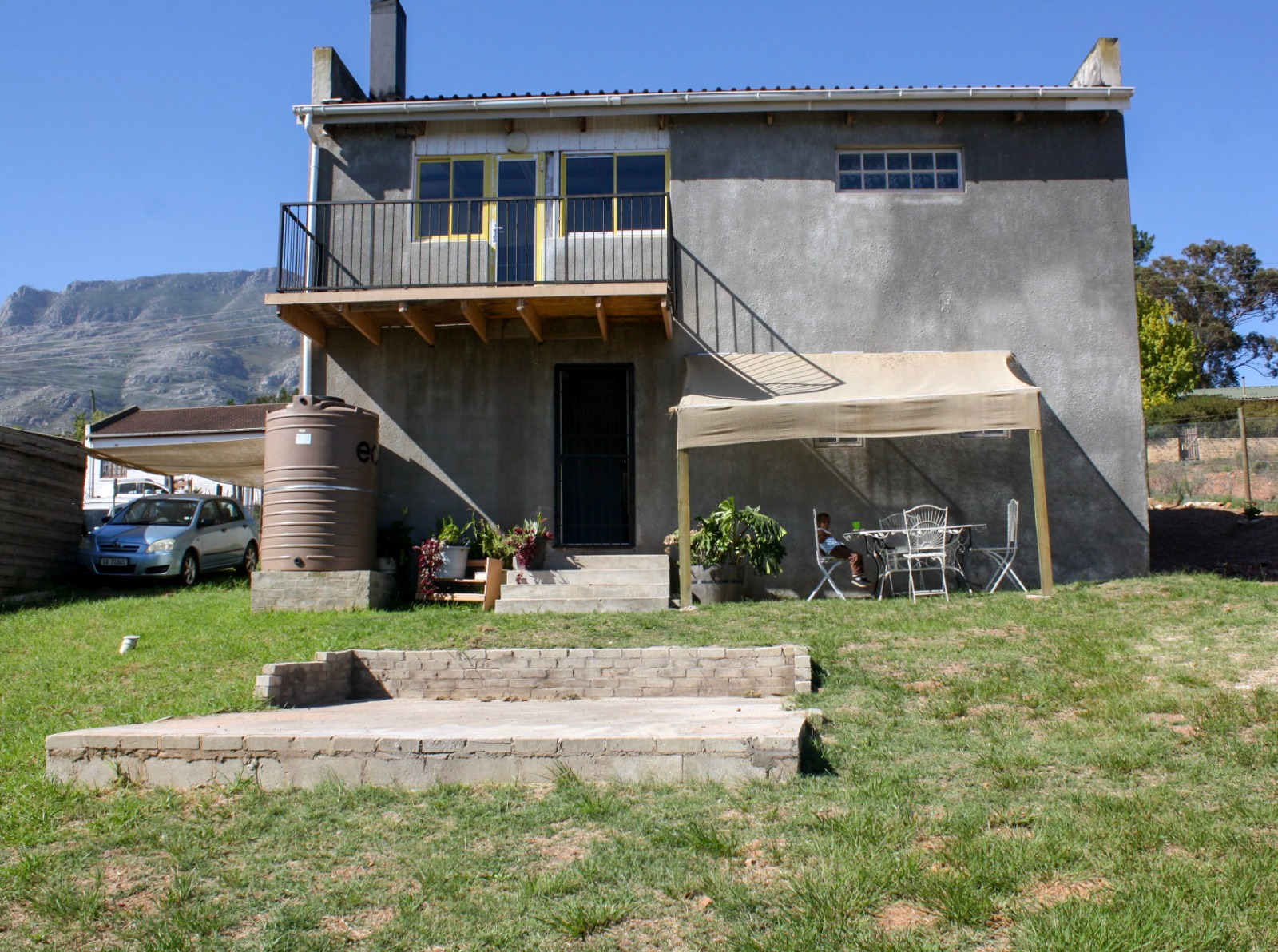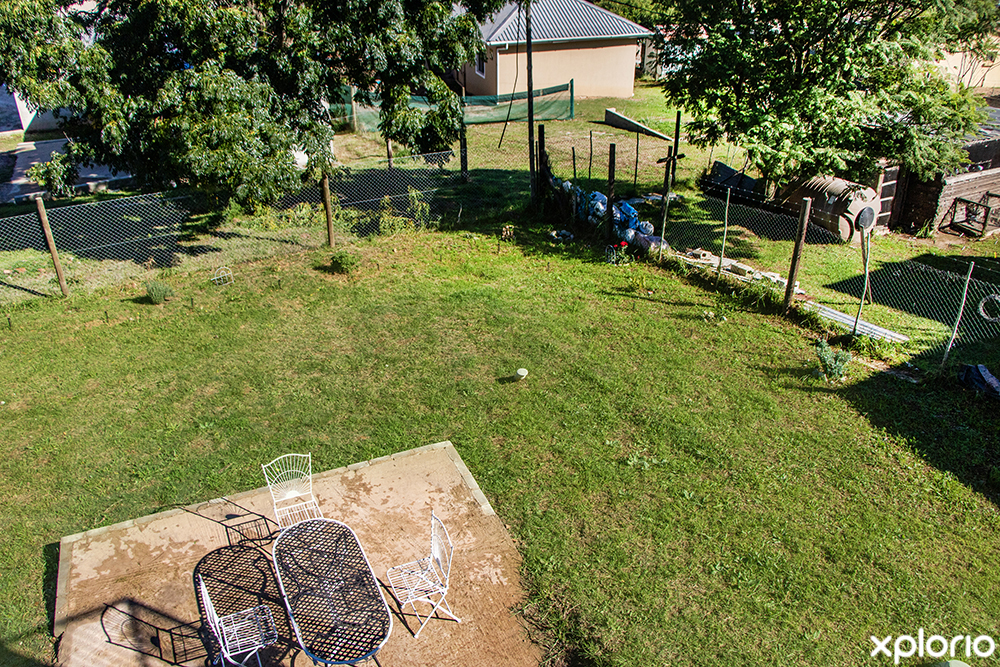 The double-storey house has an enclosed garden with a lush lawn. There is a braai and a table with chairs in the garden.