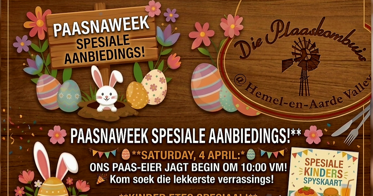 This Easter season, Die Plaaskombuis invites you to enjoy a warm, family-friendly experience in the heart of Hemel-en-Aarde Valley.