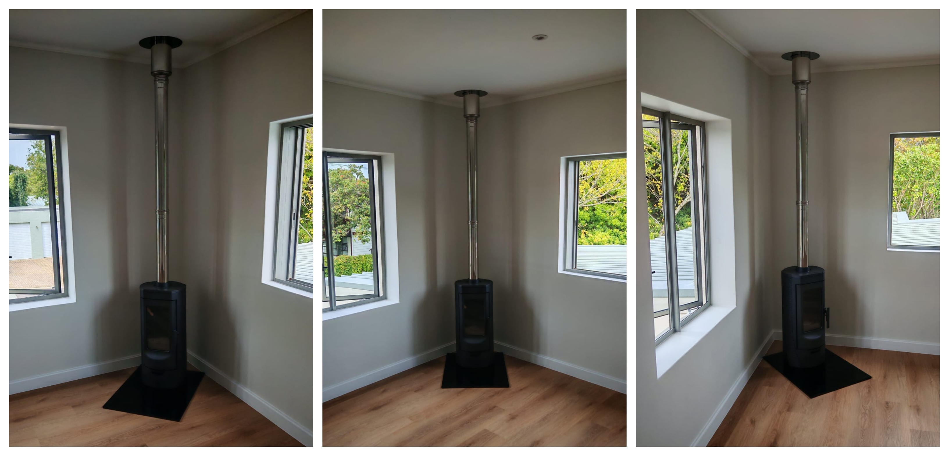 Supply and installation of a Plamen Tara 8kW fireplace, complete with stainless steel flues and a glass baseplate.