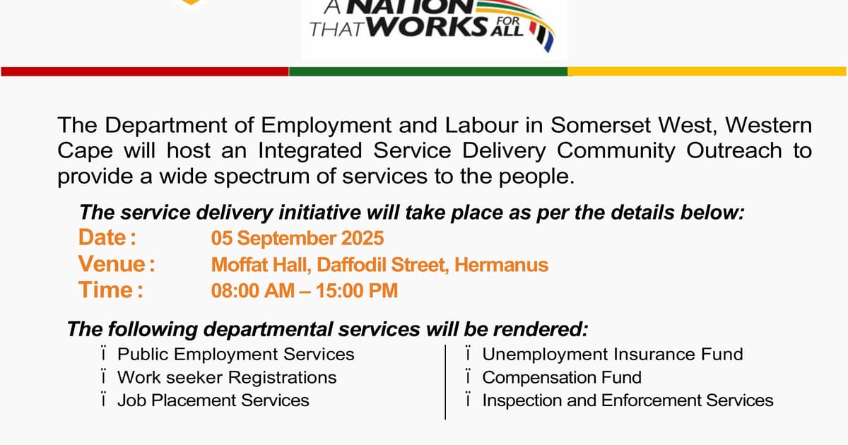 The Department of Employment and Labour will host an Integrated Service Delivery Community Outreach to provide a wide range of services to the public.