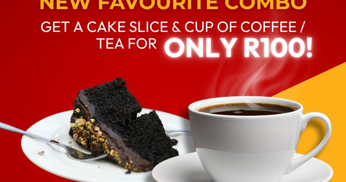 Get a slice of delicious cake and a cup of coffee or tea for only R100.00! This amazing deal is available: