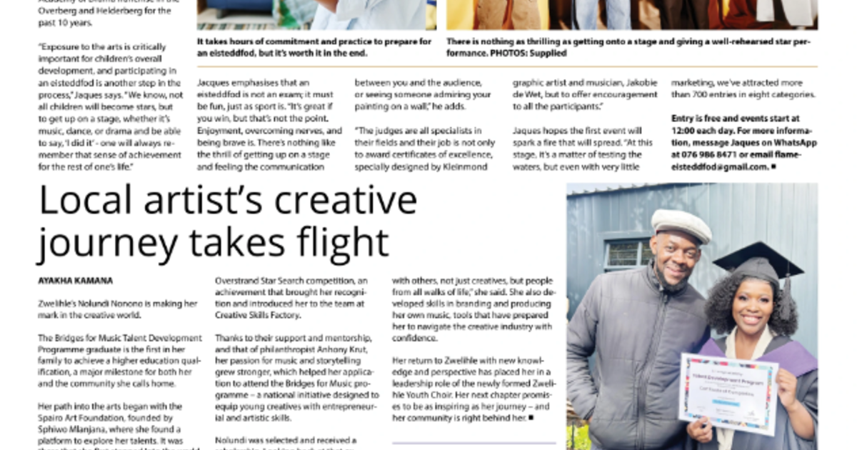 Zwelihle’s Nolundi Nonono is making waves in the creative world as the first in her family to earn a higher education qualification through the Bridges for Music Talent Development Programme. Her journey began at the Spairo Art Foundation and led to achievements like winning the Overstrand Star Search competition and receiving a scholarship. Now back in Zwelihle, she's using her experience to lead and inspire as part of the newly formed Zwelihle Youth Choir.