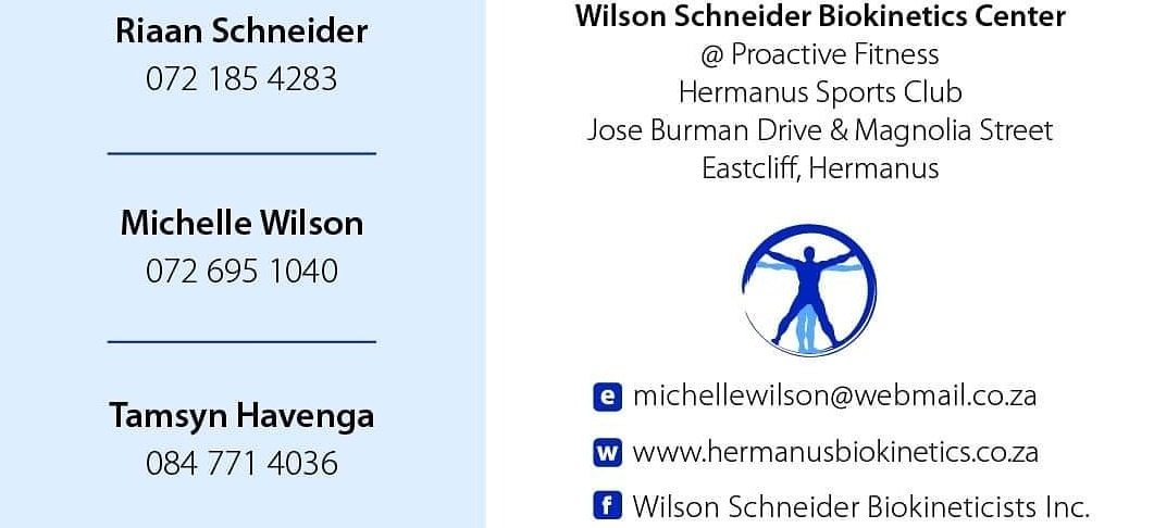 As biokinetcists we prescribe exercise and promote physical activity to assist you to stay active and healthy (PREVENTION is better than CURE), or to enhance sports performance or to Pre/Rehabilitate injures or chronic dieases or conditions to ensure you live your best life! Our fully equipped practice was established in 2007 and is located at Proactive Fitness, Hermanus Sports Club, Magnolia St & Jose Burman Drive, Eastcliff, Hermanus. We have 3 registered and experienced biokinetictists available to assist you in improving your health, wellness and quality of life. We also offer clinical rehabilitation pilates, as well as matwork and reformer pilates (STOTT pilates). We look forward to assisting you with your health and wellness goals, no matter what they are.