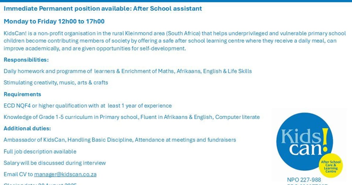 Join the Kidscan! team. We have a vacant position for an afternoon assistant to start immediately.