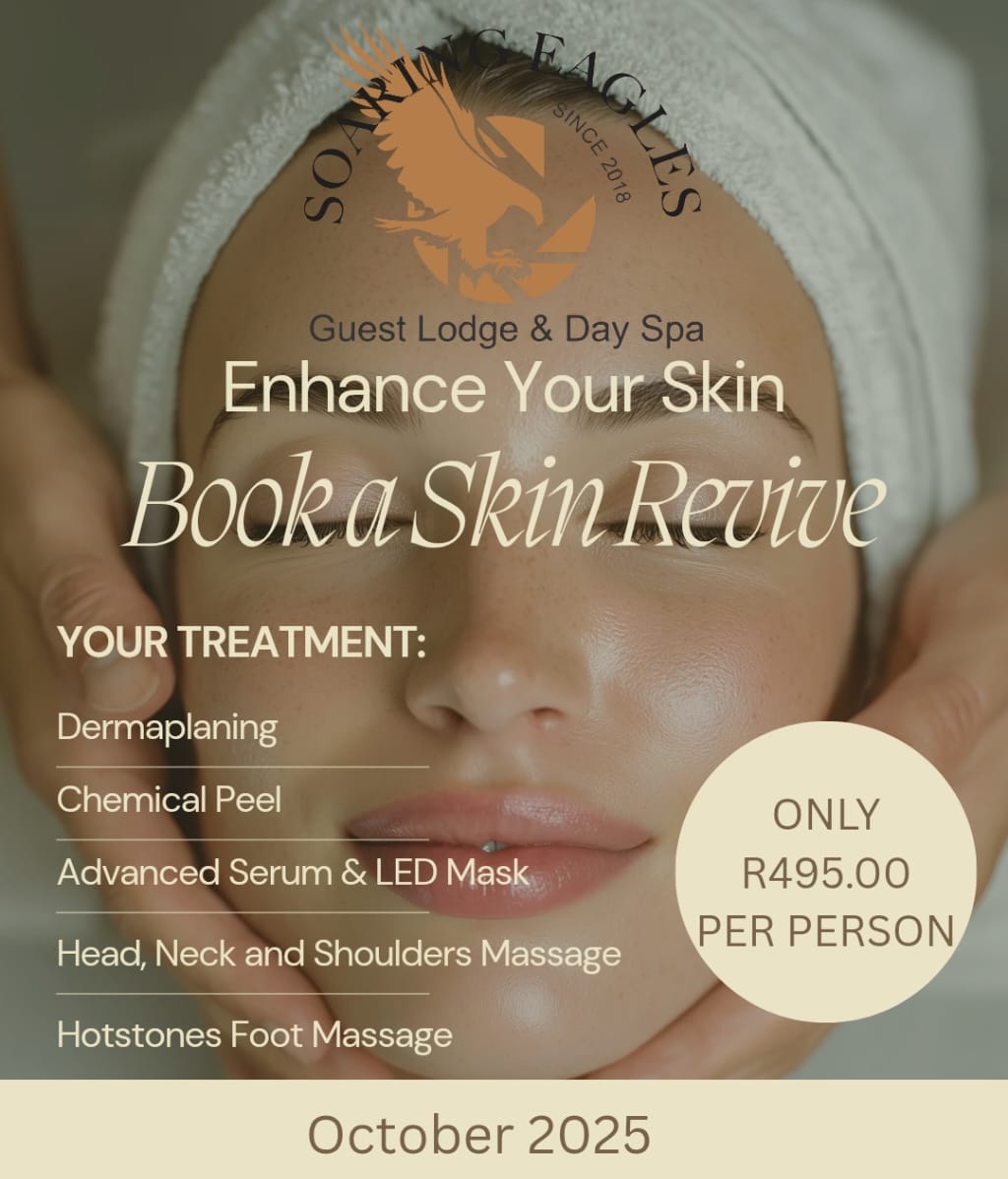 Book your Skin Revive this October at Soaring Eagles Guest Lodge & Day Spa for only R495 per person.
