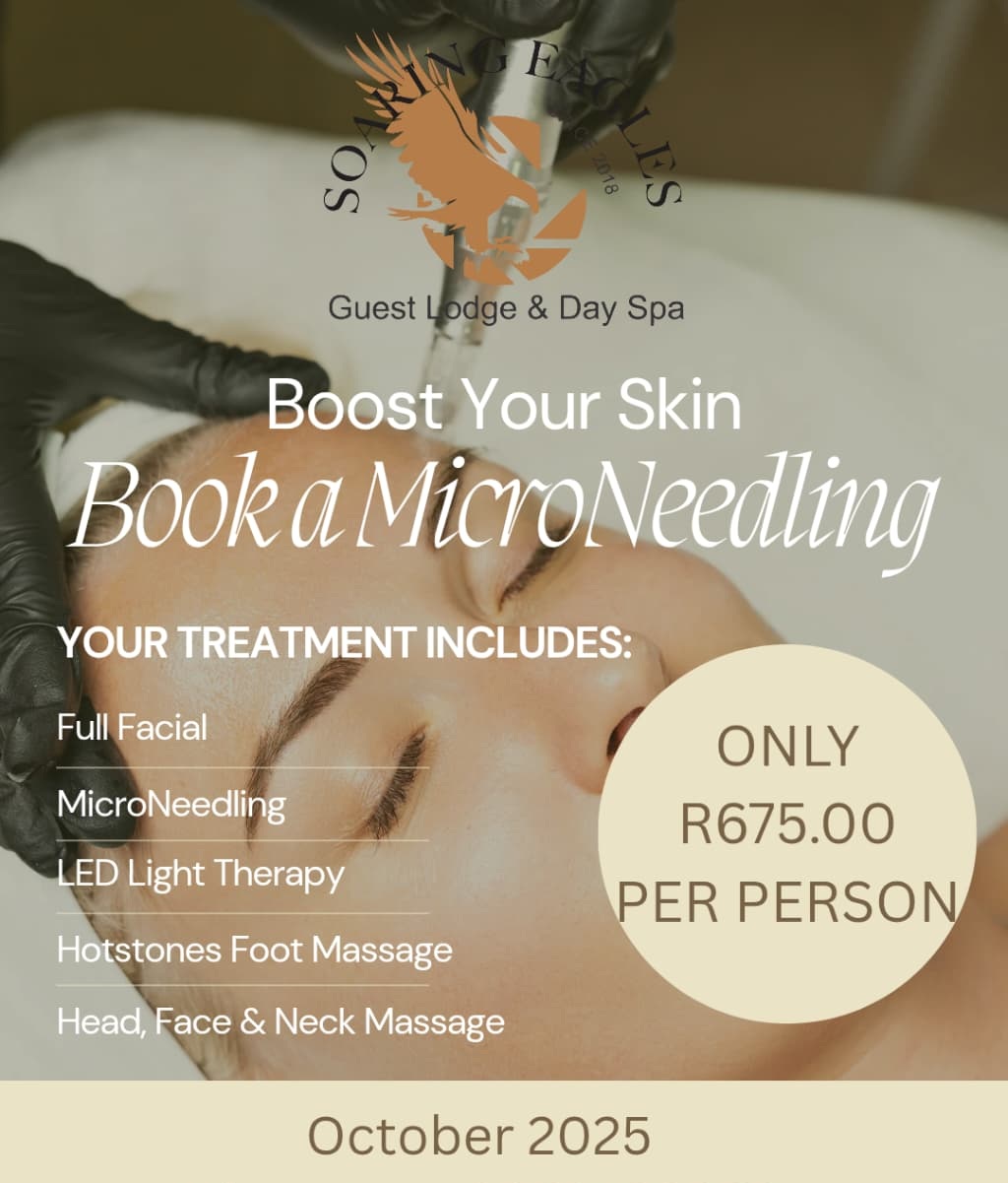 Book your MicroNeedling treatment this October at Soaring Eagles Guest Lodge & Day Spa for only R675 per person.