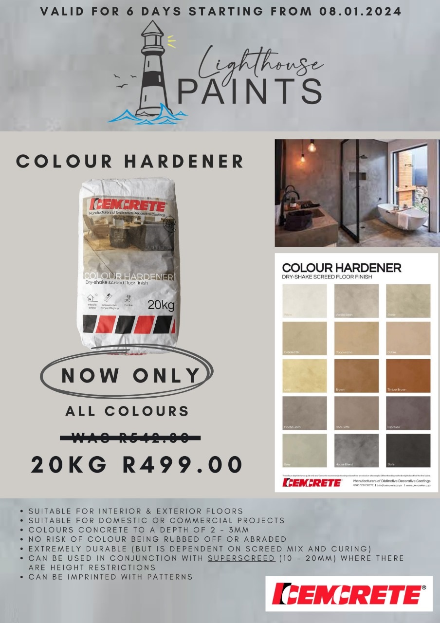 Cemcrete Colour Hardener is a granolithic concrete material that is floated into fresh screed or concrete which colours, strengthens and creates durable surfaces for the concrete floors. It is a special blend of cement incorporating very hard-wearing aggregates, light fast pigments and additives which set rock-hard and which has exceptional abrasion resistance.