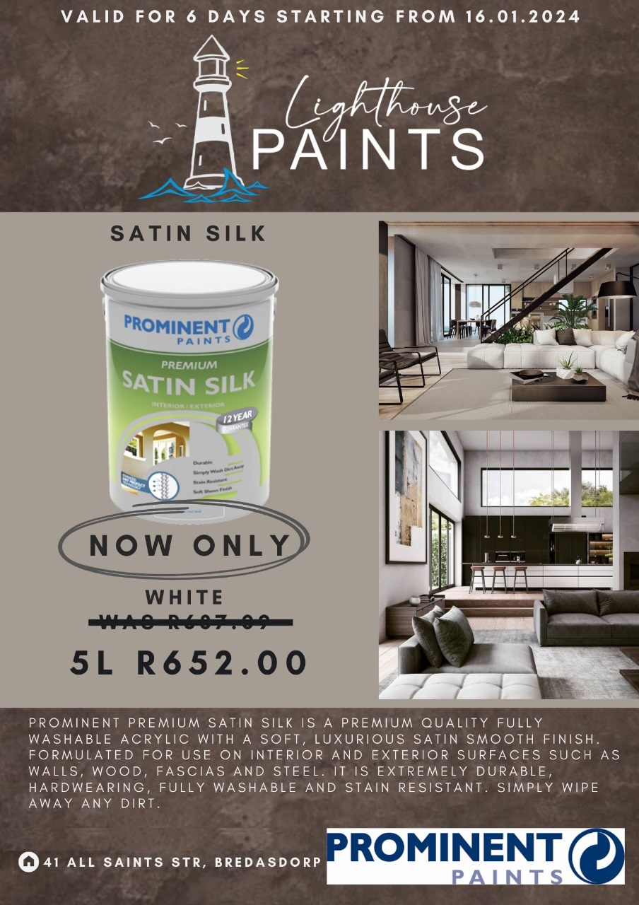 Lighthouse Paints presents Premium Satin Silk in white at a special price of R652.00 for 5L.