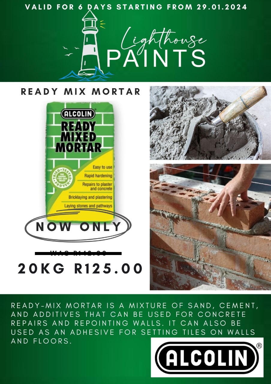 Lighthouse Paints presents Ready Mixed Mortar at a special price of R125.00 for 20kg.