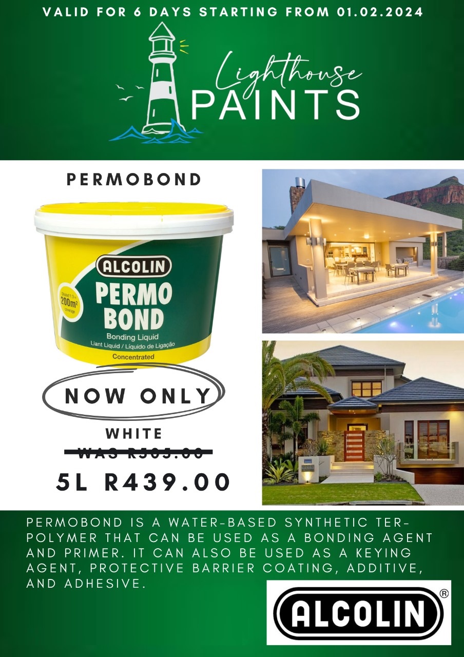 Lighthouse Paints presents Alcolin Permobond in white at a special price of R439.00 for 5L.