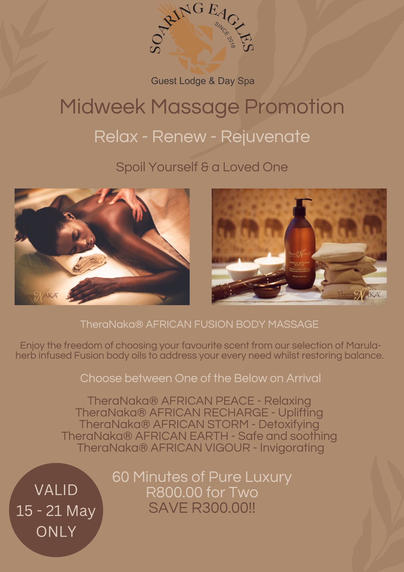 For more information, contact Soaring Eagles Guest Lodge and Day Spa.