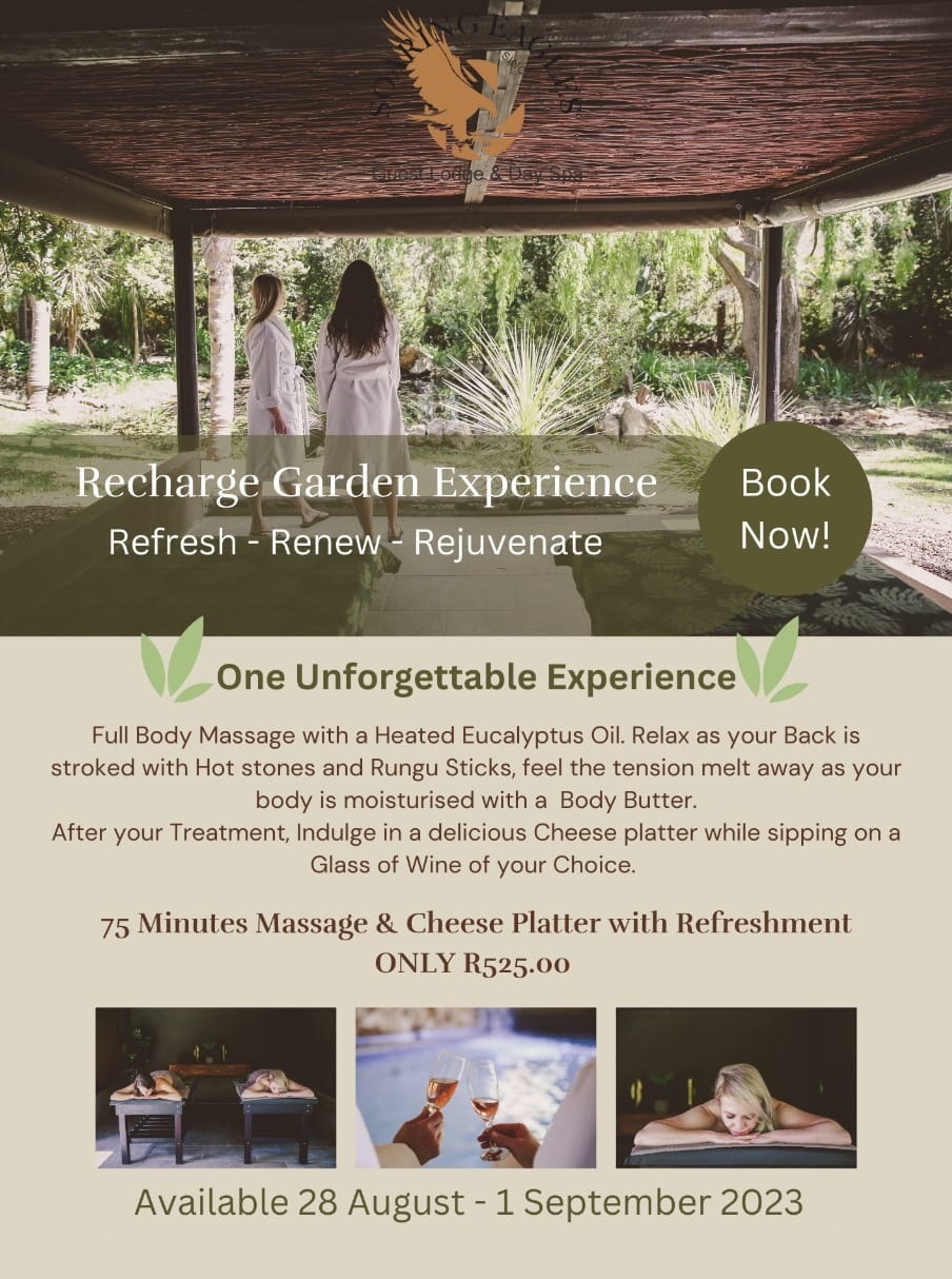 For more information or to book, contact Soaring Eagles Guest Lodge & Day Spa.
