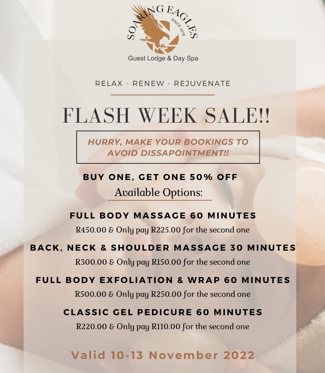 Treat yourself at Soaring Eagles Guest Lodge and Day Spa with our buy one, get one 50% off sale!