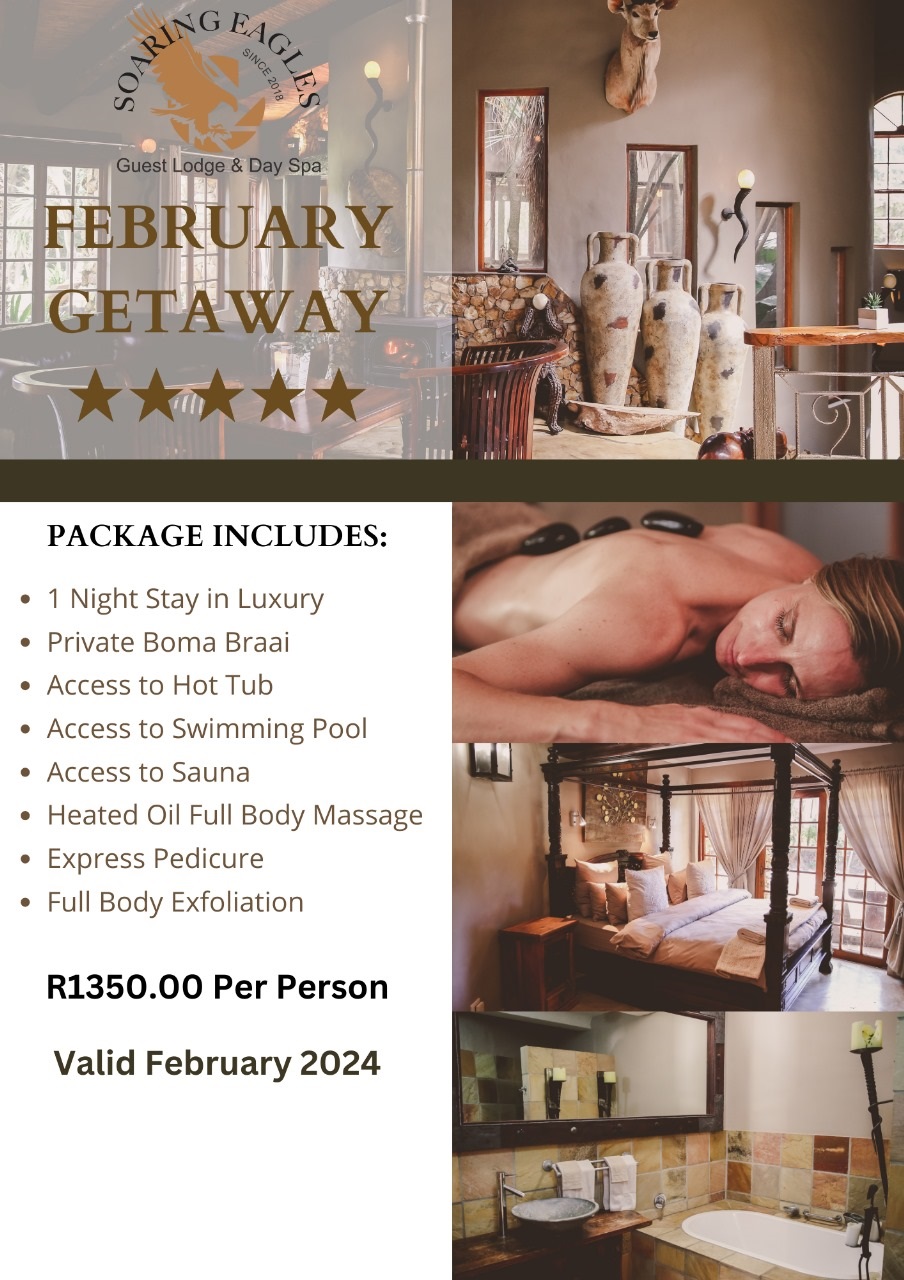 For more information or to book, contact Soaring Eagles Guest Lodge & Day Spa.