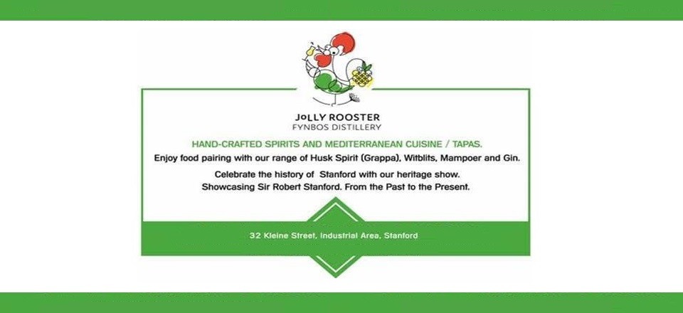 You are cordially invited to the media launch of Fynbos Distillery at Jolly Rooster on 10 & 11 December 2018 to celebrate the history of Stanford with our heritage show. Showcasing Sir Robert Stanford from the Past to the Present.