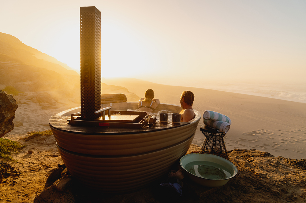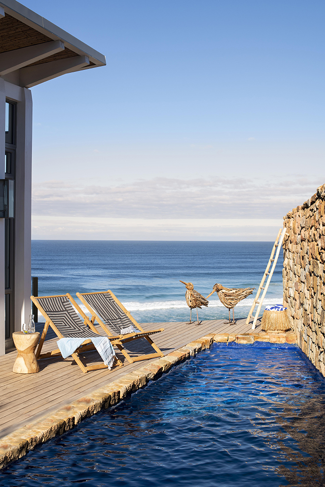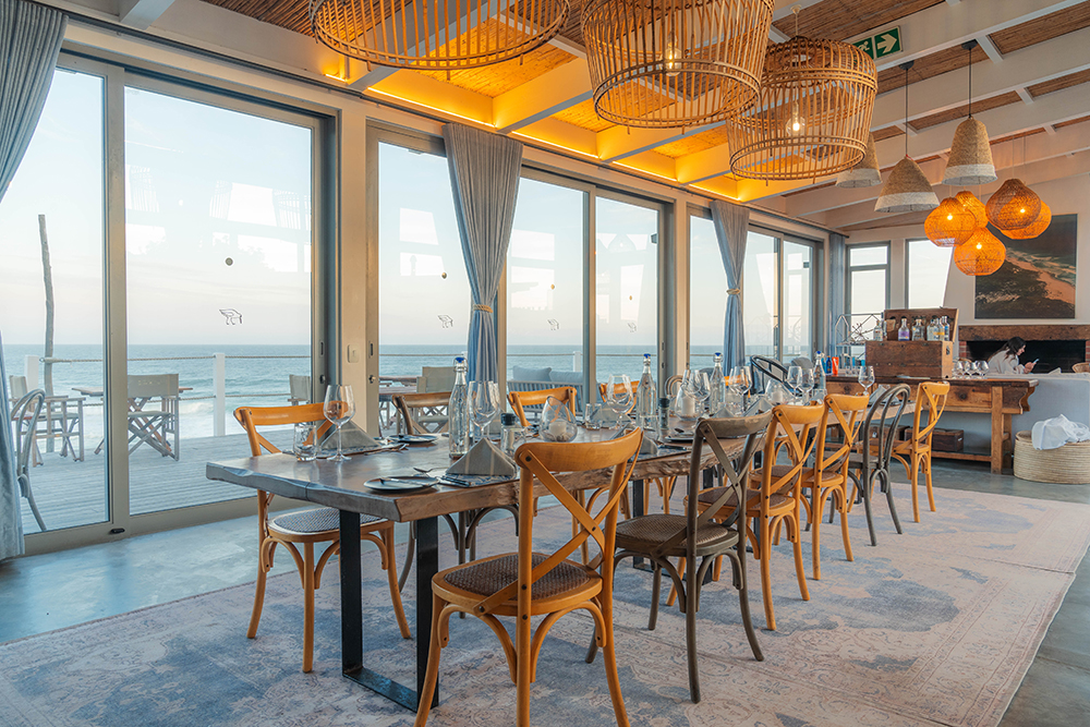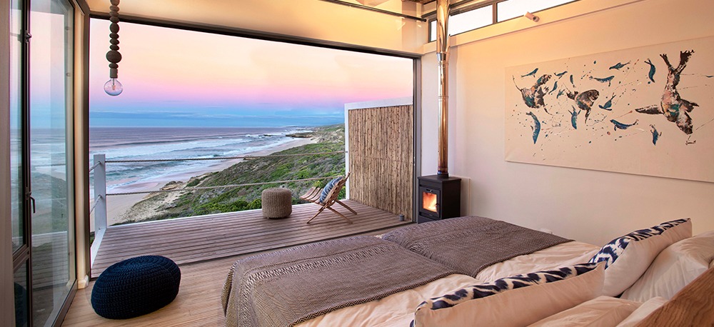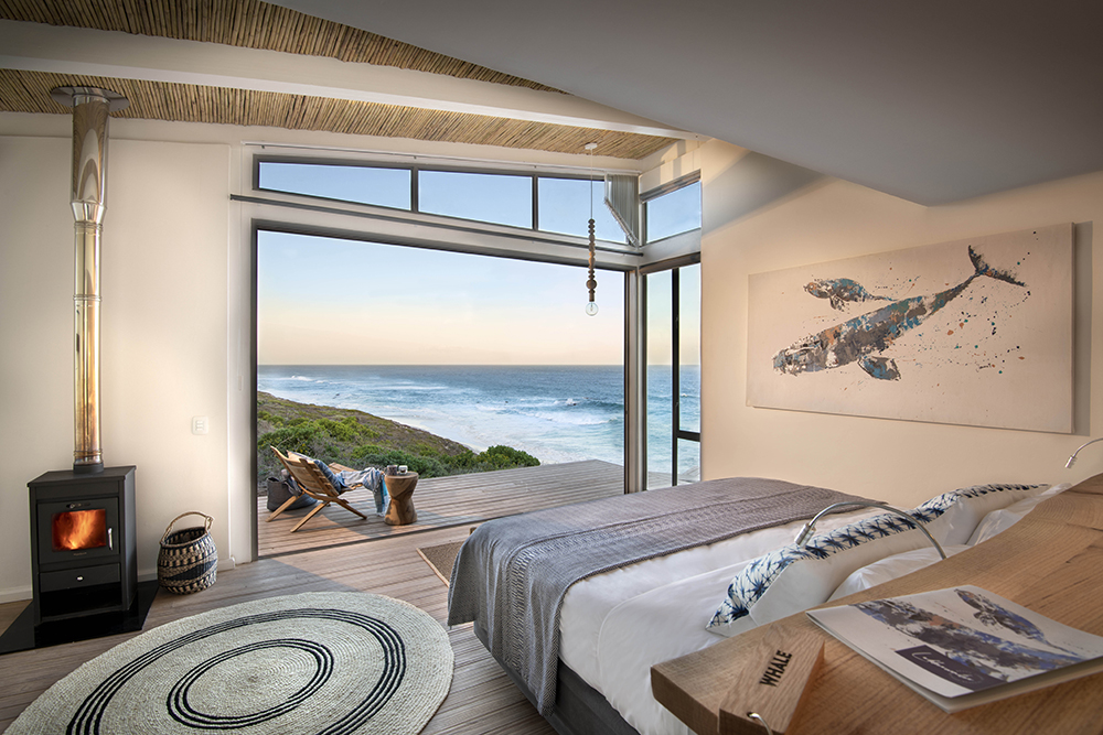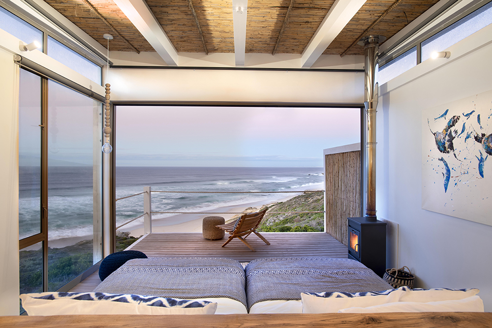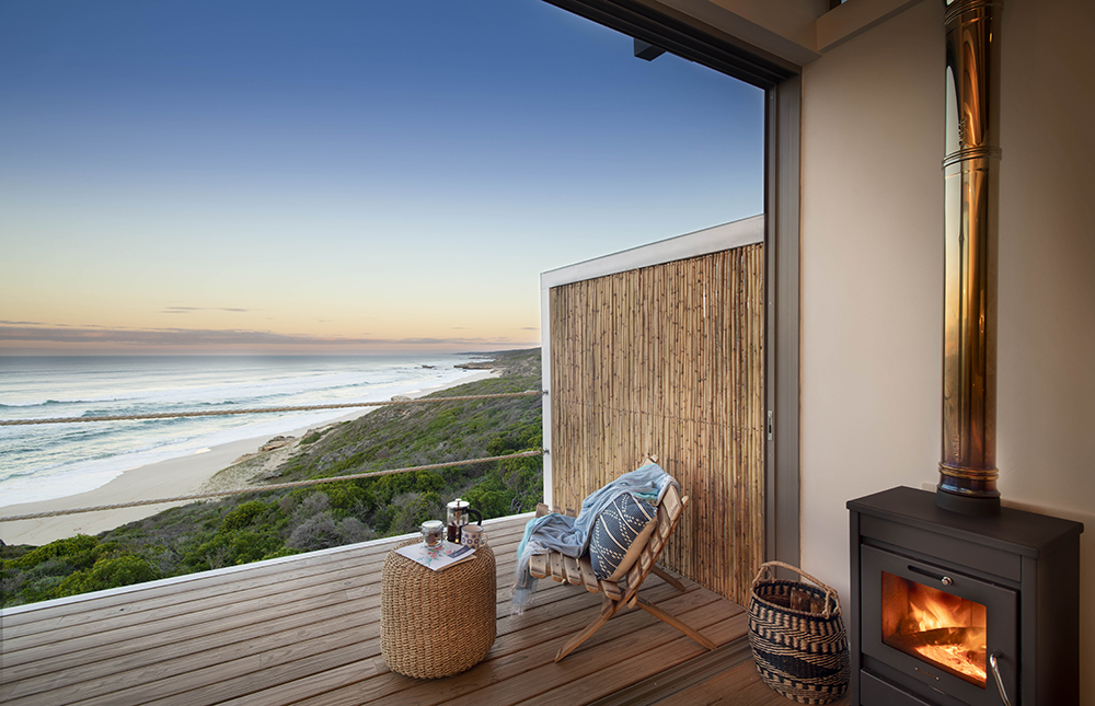 Minimalistic-styled suites are designed to highlight stunning, floor-to-ceiling ocean views, featuring coastal-inspired decor, and a cosy wood-burning stove. The open-plan layout seamlessly connects the interior to the natural beauty of the surrounding De Hoop Nature Reserve. It extends onto a private deck, offering an intimate yet comfortable beachfront experience that prioritises natural luxury.